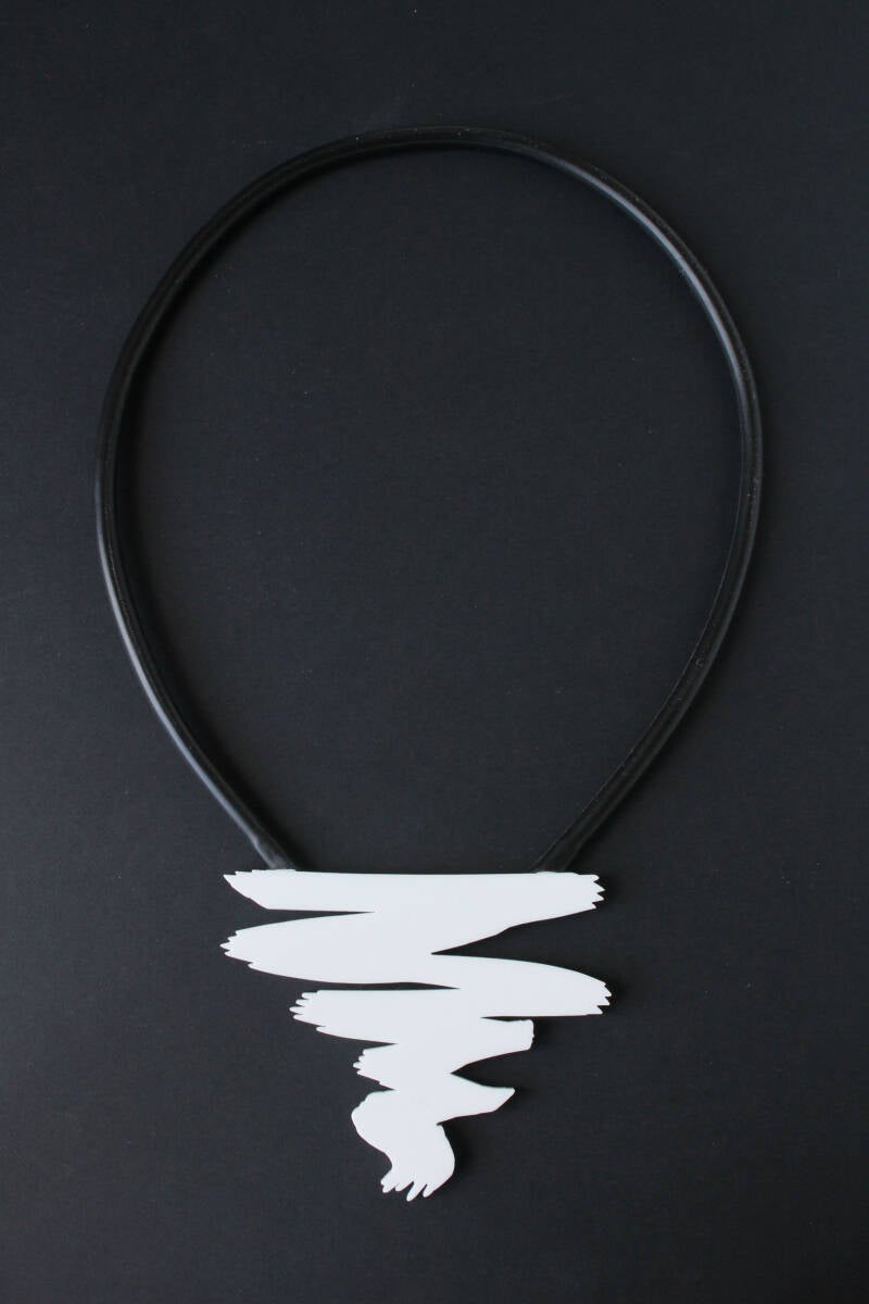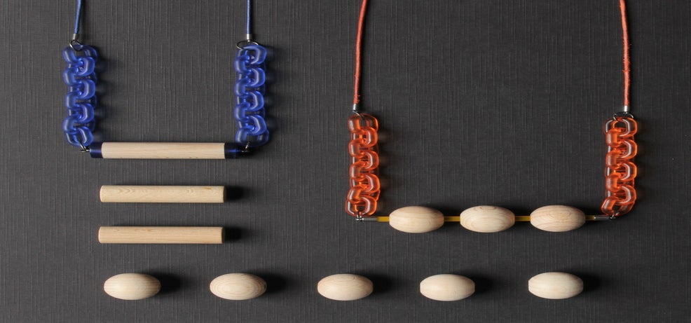 Met de hand gemaakte draagbare sieraden van diverse materialen. Kettingen, armbanden, ringen en oorbellen van beukenhout, polymeerklei, acrylaat/plexiglas, koper, leer en combinaties hiervan.