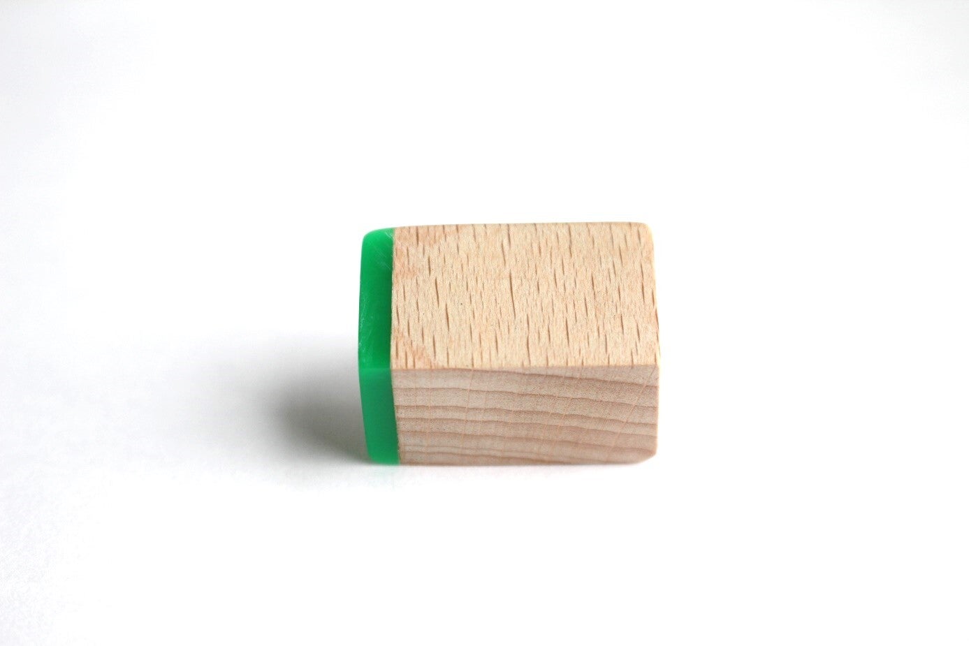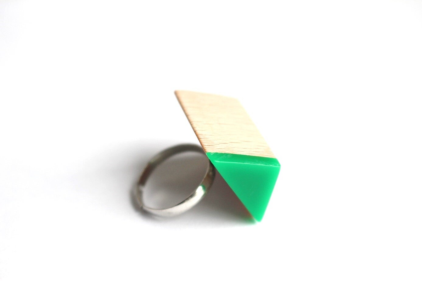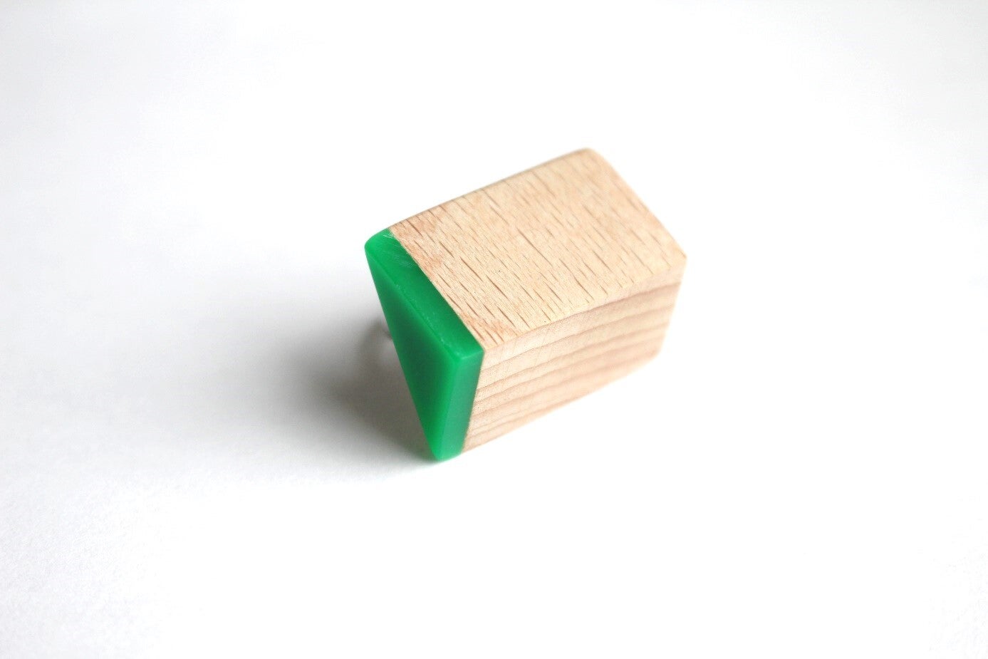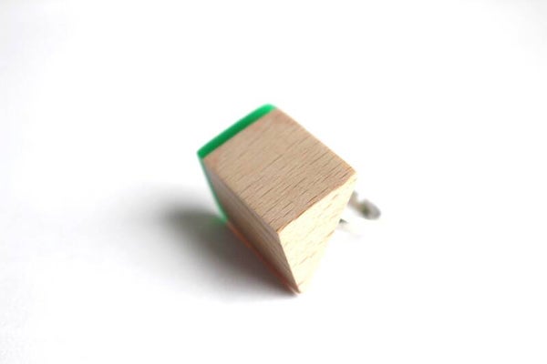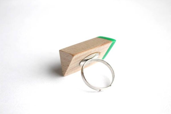 Verstelbare ring (1,8 cm) van beukenhout en semi groen acrylaat. De ring is voorzien van een wax om het materiaal te beschermen tegen vocht en vuil.