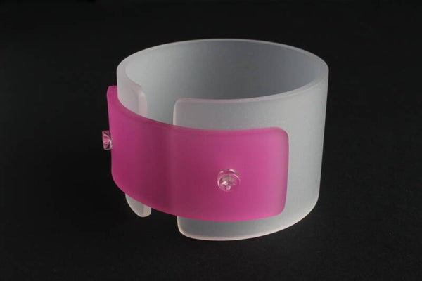 Armband van opaal wit en opaal roze mat acrylaat. De delen zijn vastgezet met boutjes en moertjes van transparant acrylaat.
