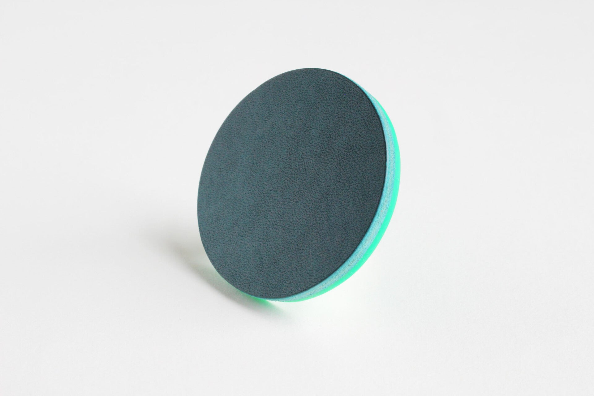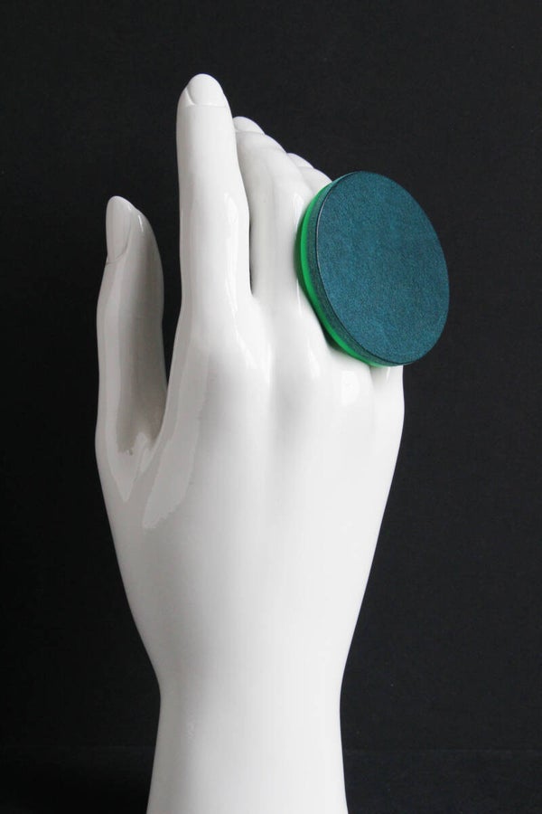 Verstelbare metalen ring van groen acrylaat gelamineerd met petrol tuigleer.