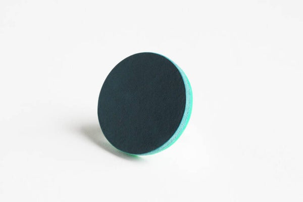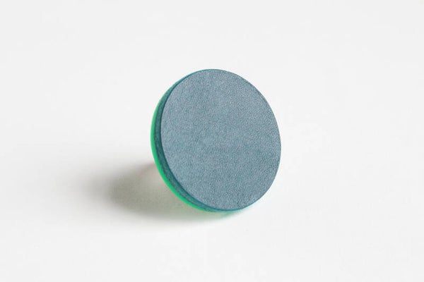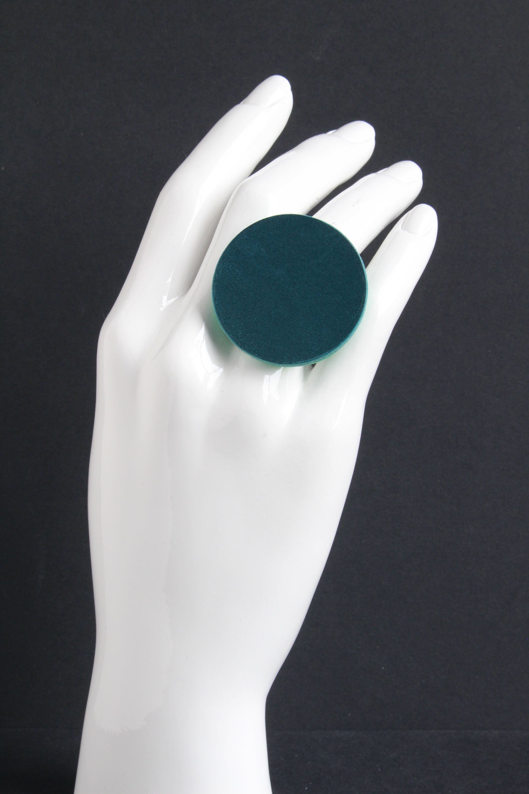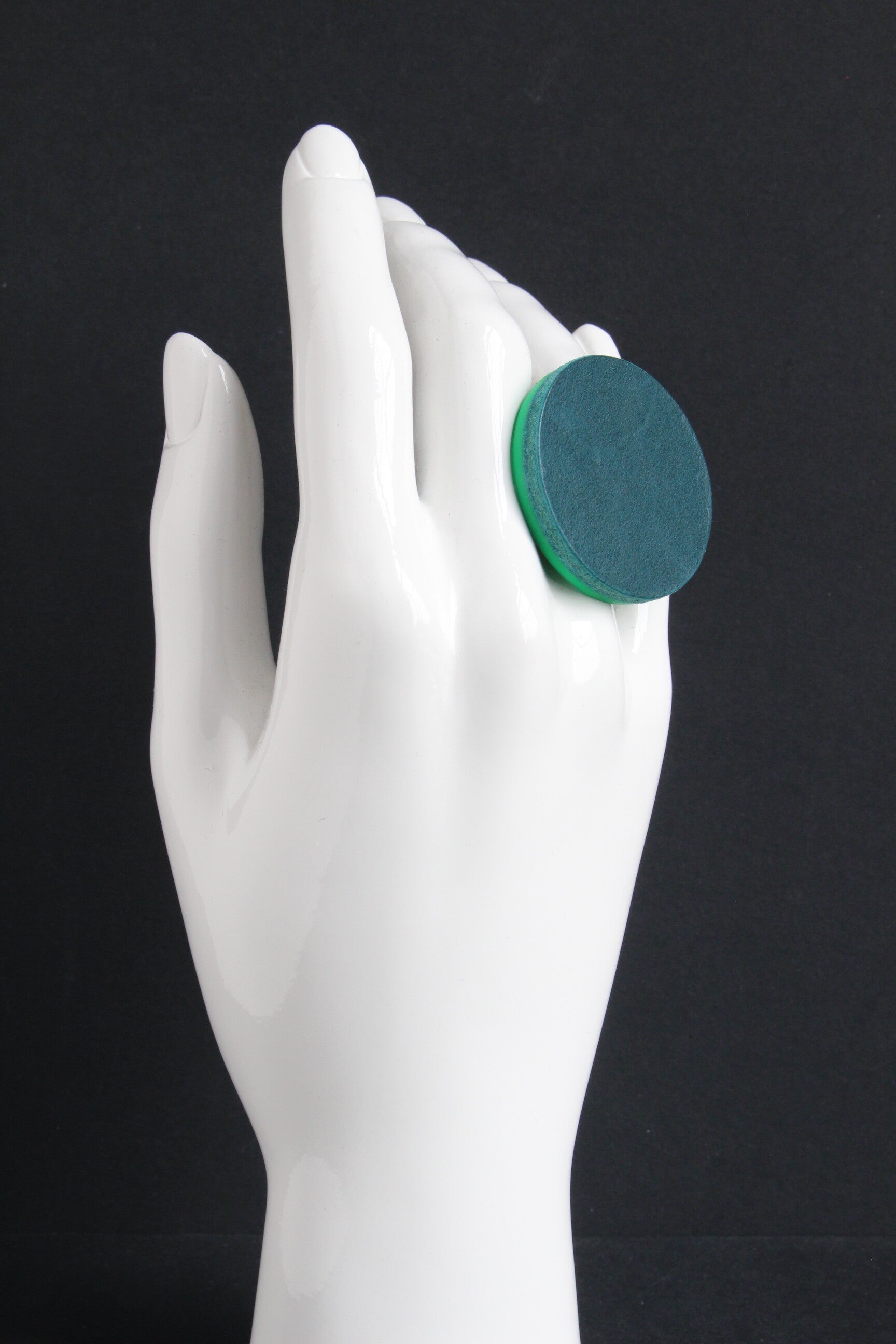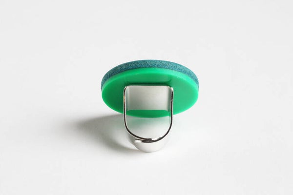Verstelbare metalen ring van groen acrylaat gelamineerd met dokergroen tuigleer.