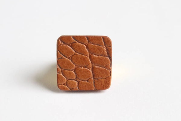 Verstelbare metalen ring van goudkleurig acrylaat gelamineerd met bruin tuigleer met slangenprint.