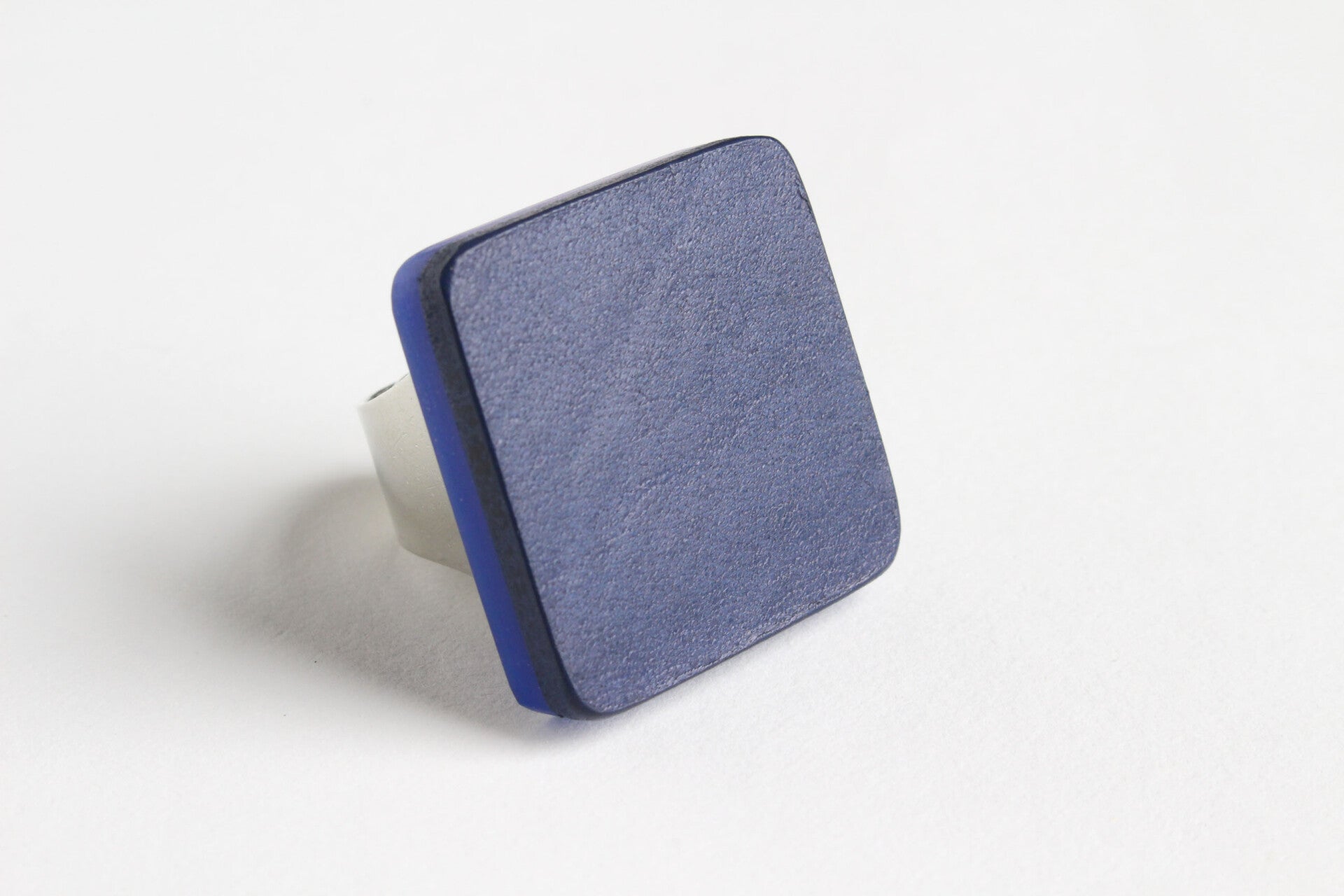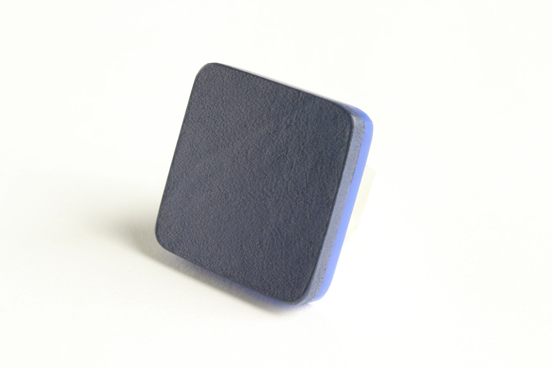 Verstelbare metalen ring van blauw acrylaat gelamineerd met blauw tuigleer.