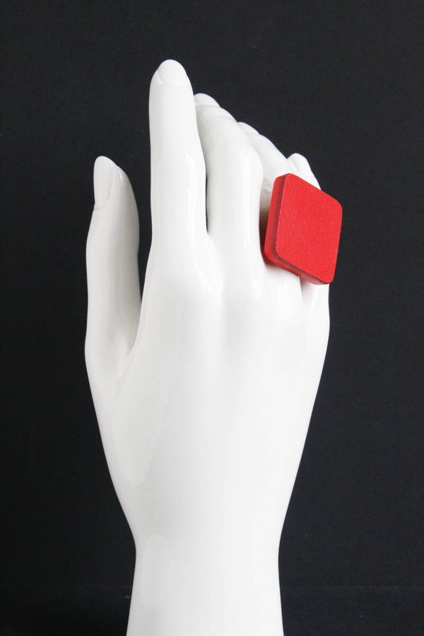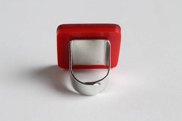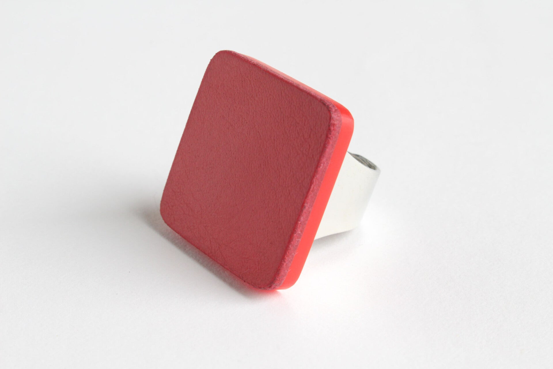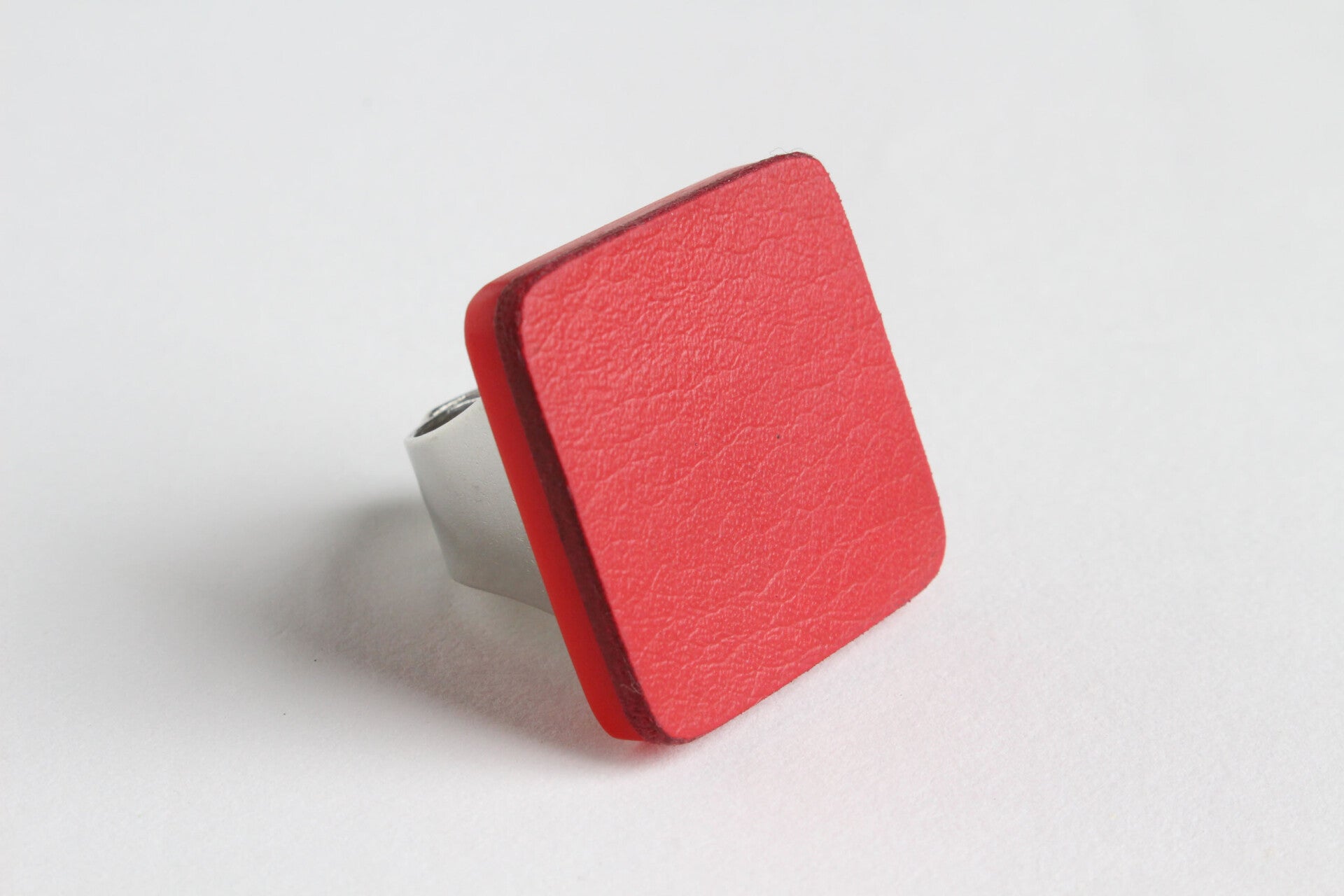Verstelbare metalen ring van rood acrylaat gelamineerd met rood tuigleer.