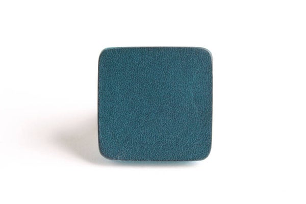 Verstelbare metalen ring van aquablauw acrylaat gelamineerd met petrol tuigleer.