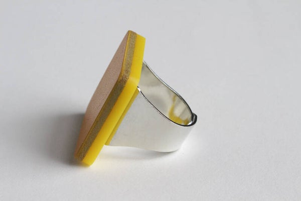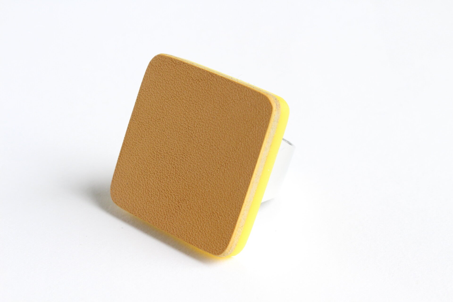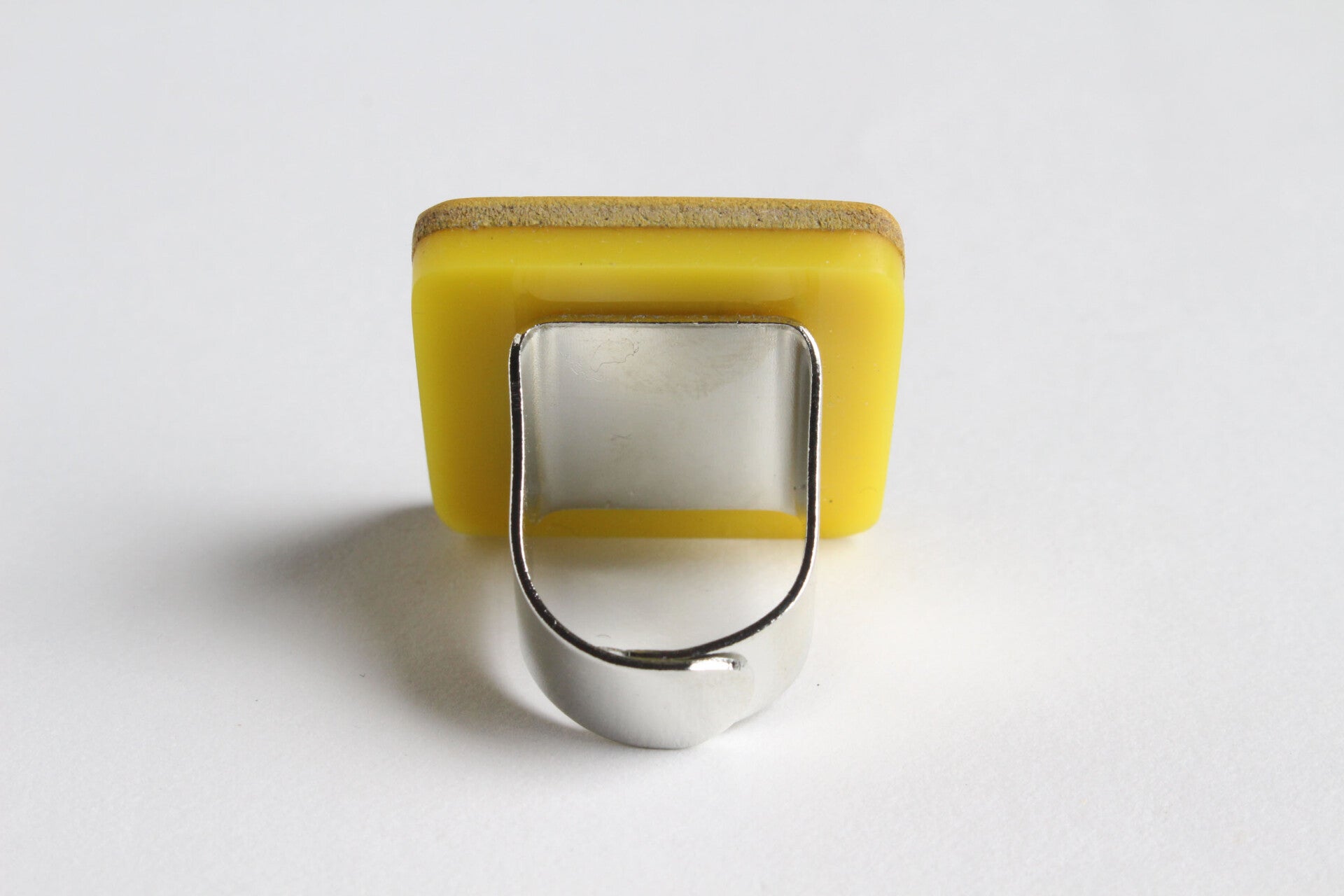 Verstelbare metalen ring van geel acrylaat gelamineerd met geel tuigleer.
