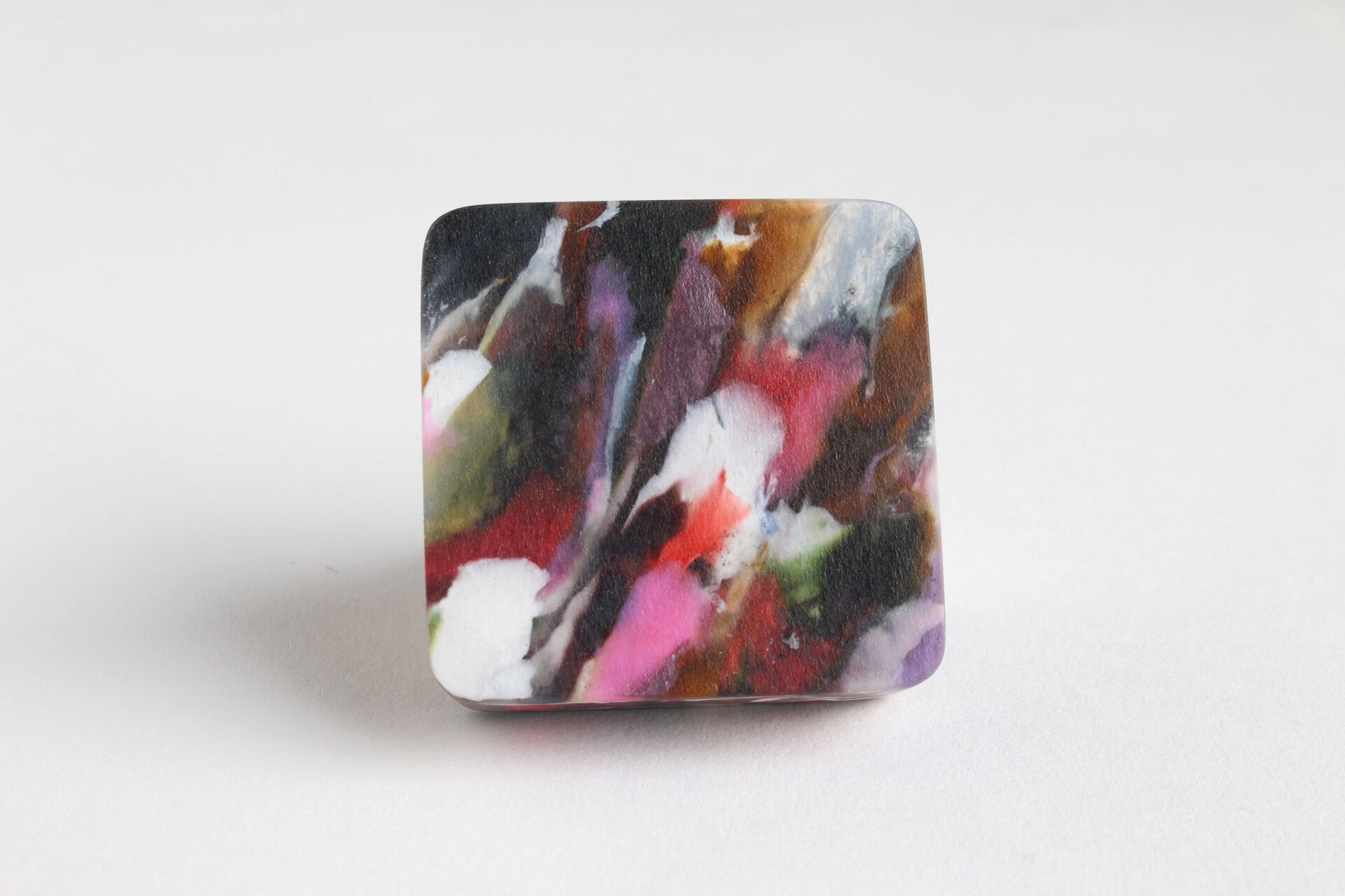 Afmetingen: 3,9 cm x 3,9 cm x dikte 1,1 cm, ring 1,7 x 1,9 cm