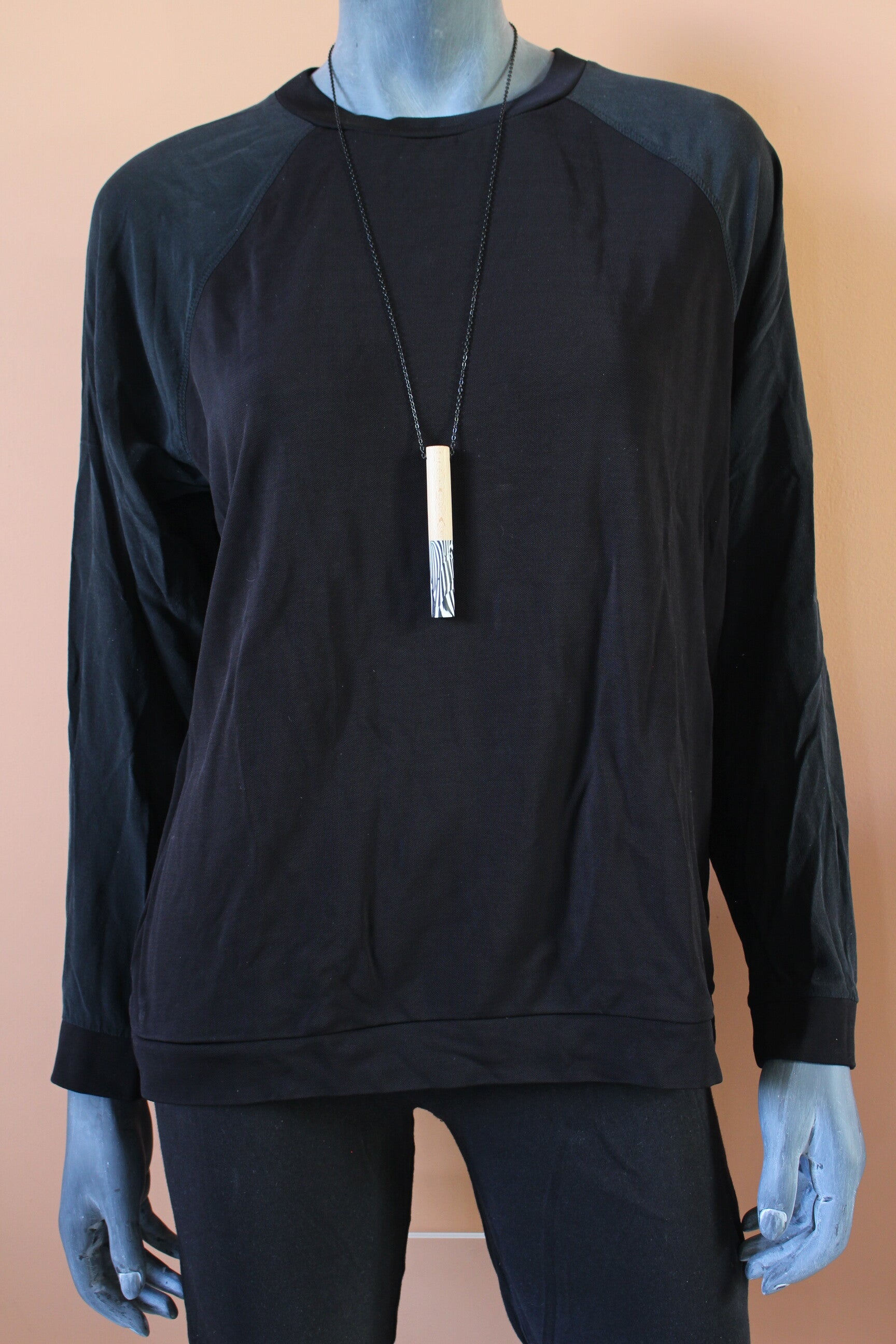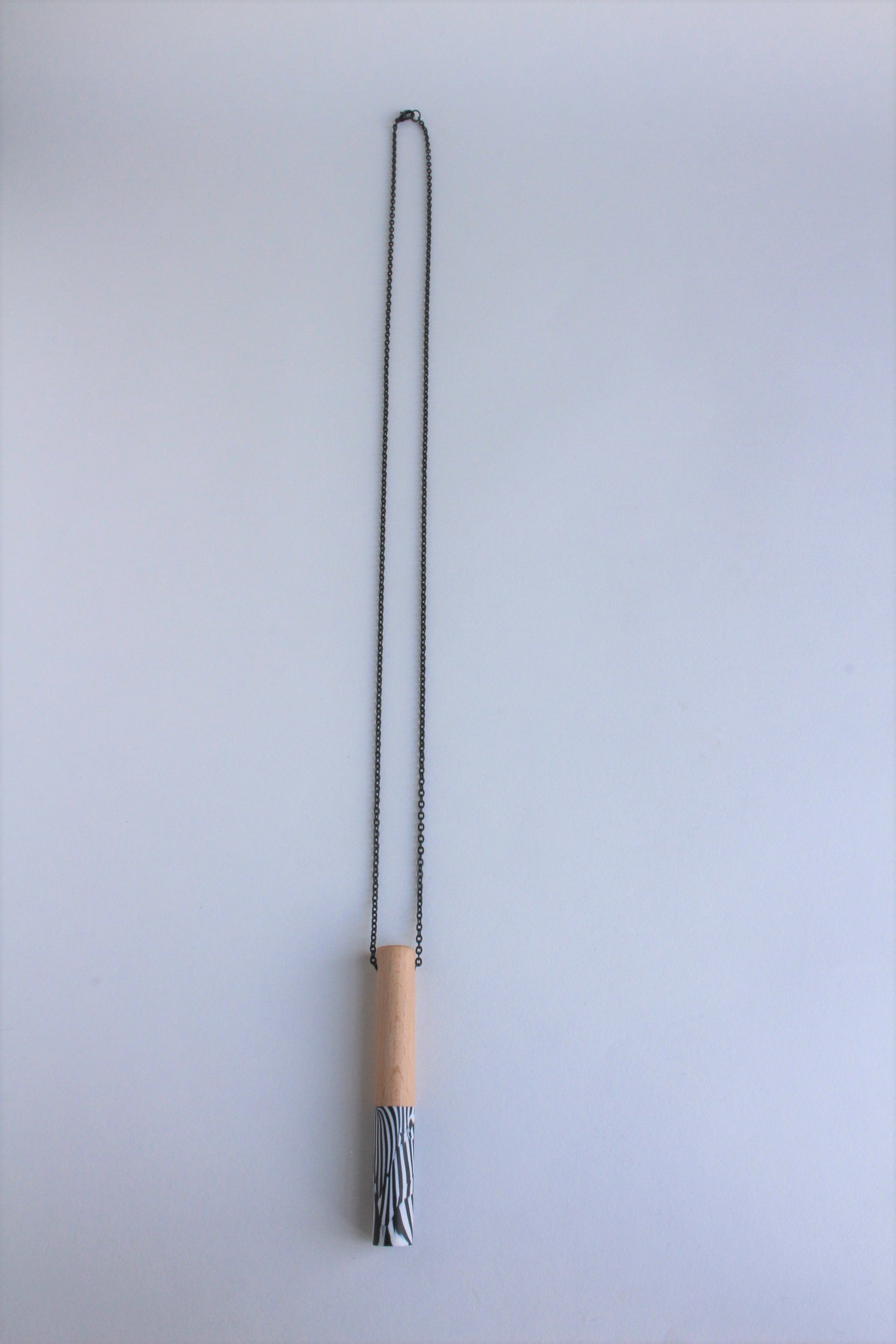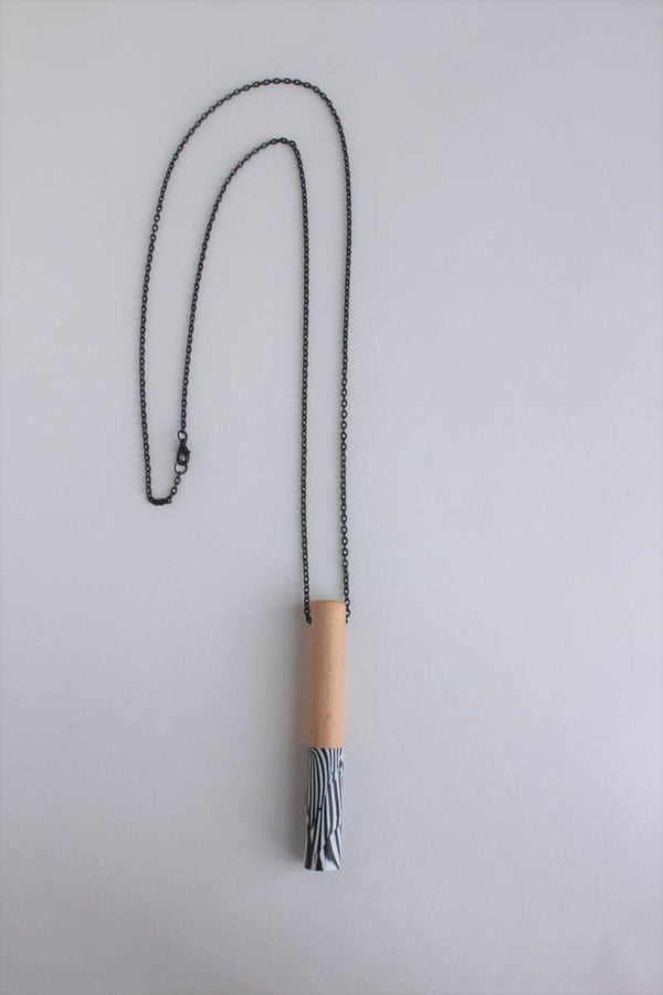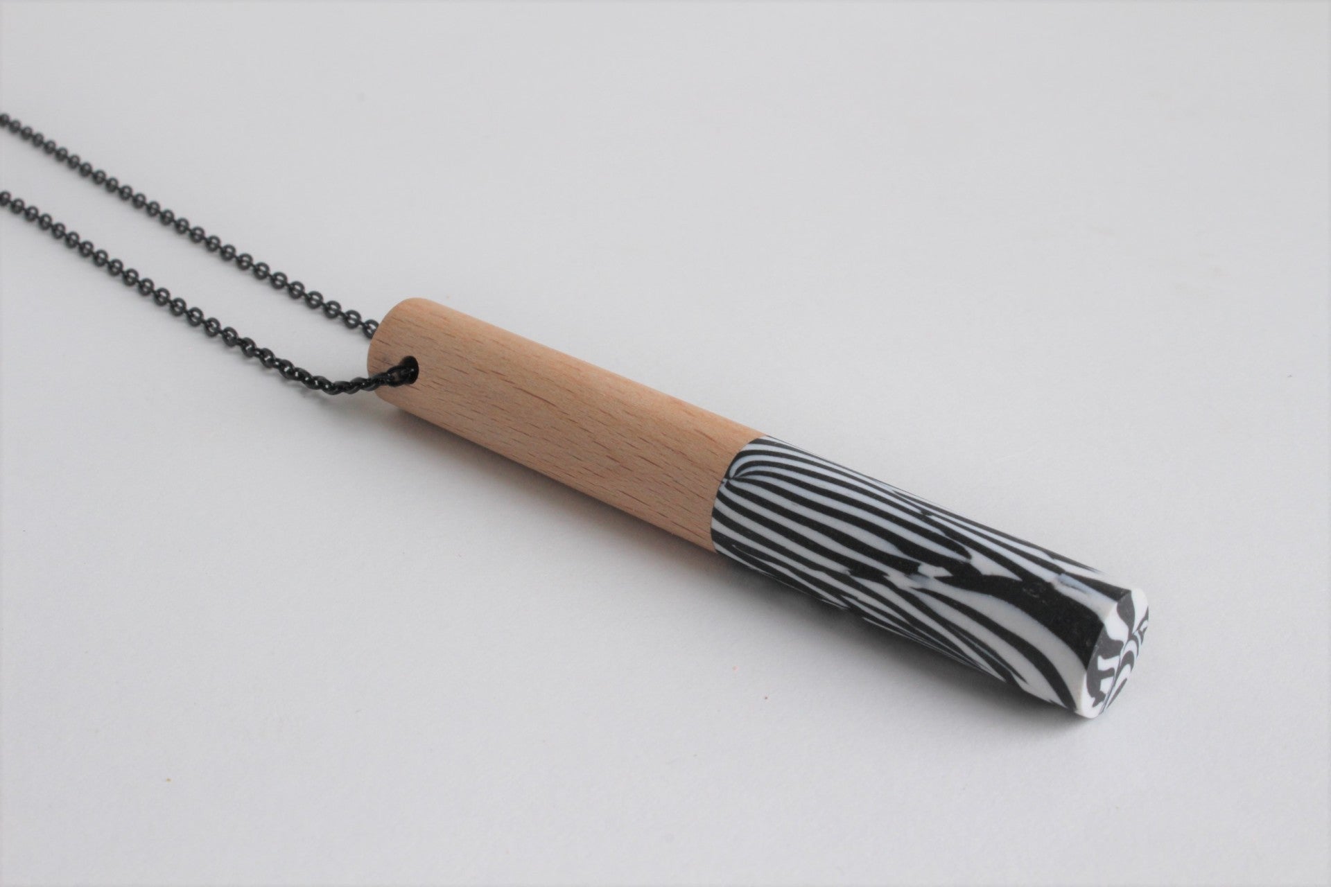 Hanger van polymeerklei en beukenhout aan een zwarte metalen ketting. De hanger is voorzien van een wax om het materiaal te beschermen tegen vocht en vuil.