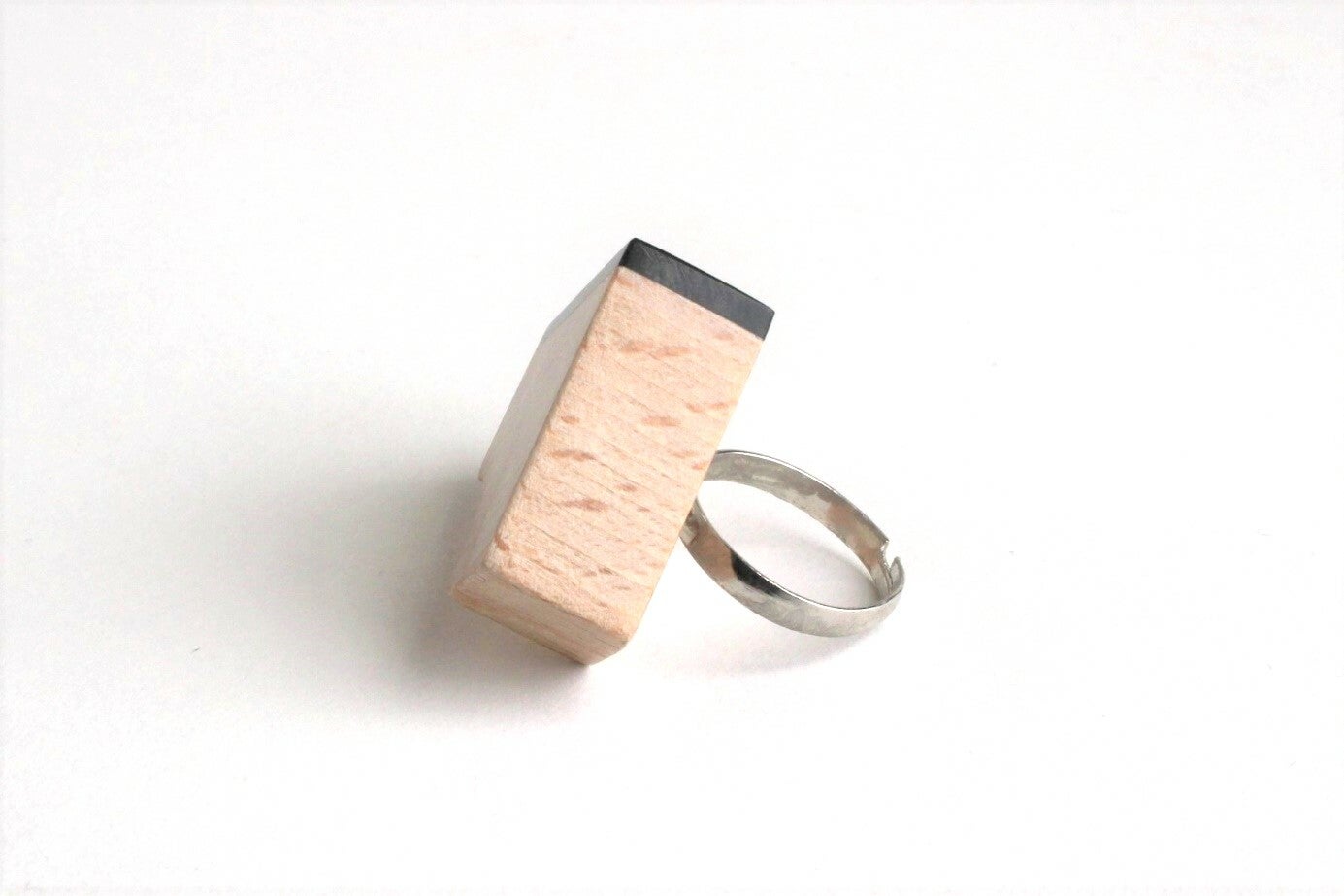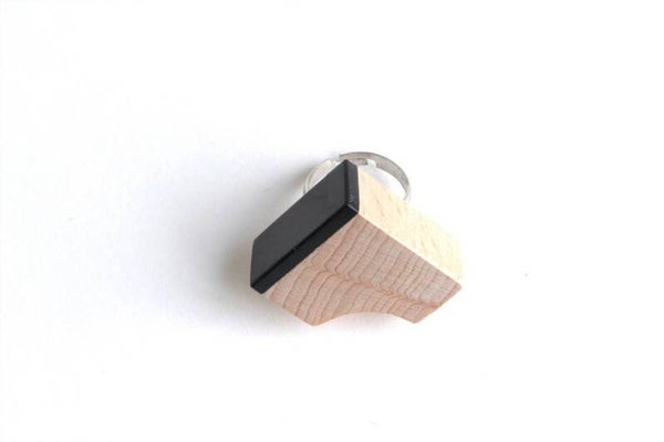 Verstelbare ring (1,8 cm) van beukenhout en acrylaat. De ring is voorzien van een wax om het materiaal te beschermen tegen vocht en vuil.