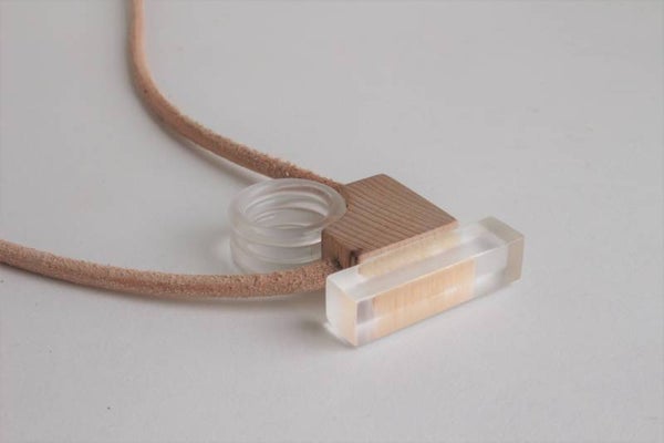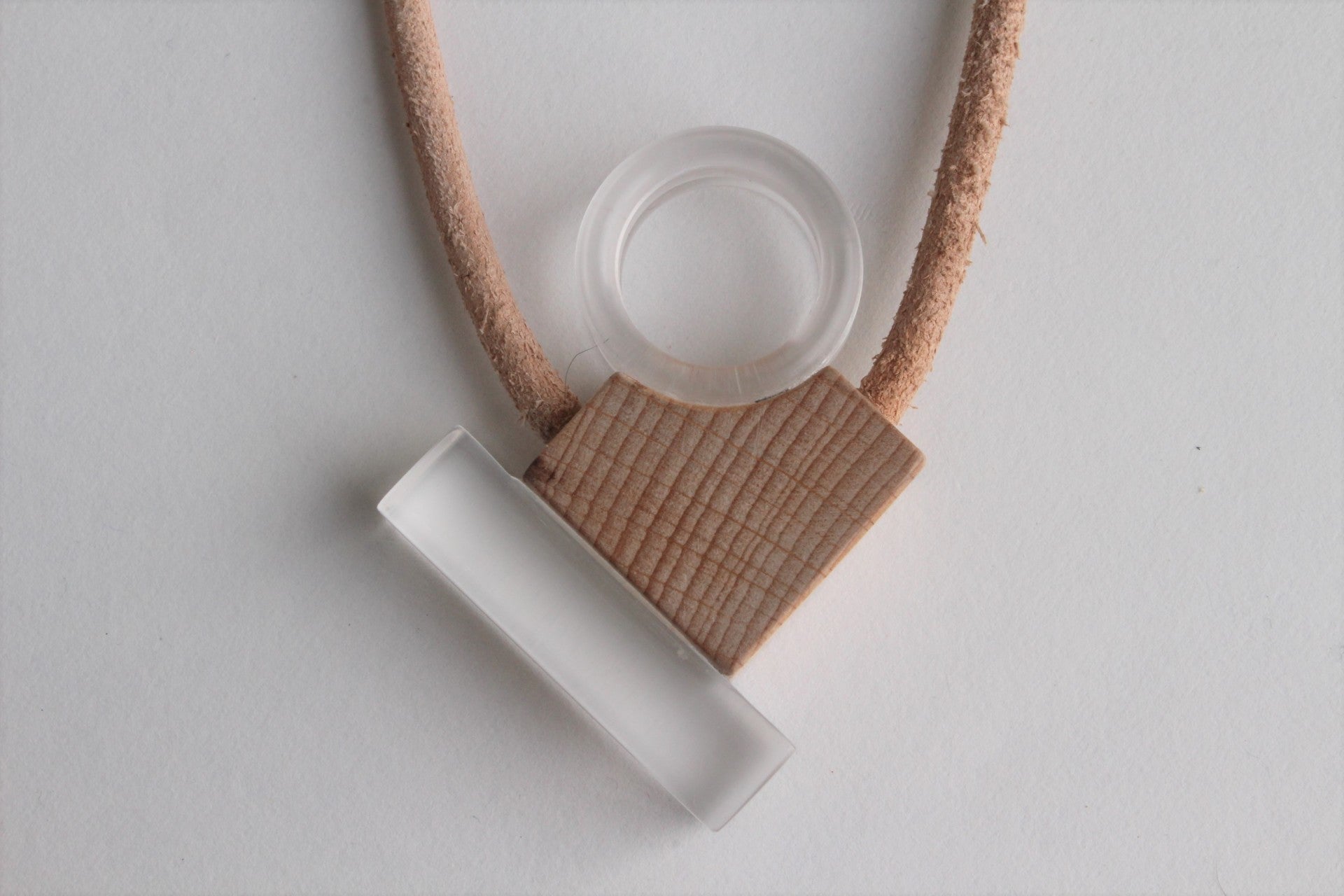 Hanger van acrylaat en beukenhout aan een koord van leder. De hanger is voorzien van een wax om het materiaal te beschermen tegen vocht en vuil.