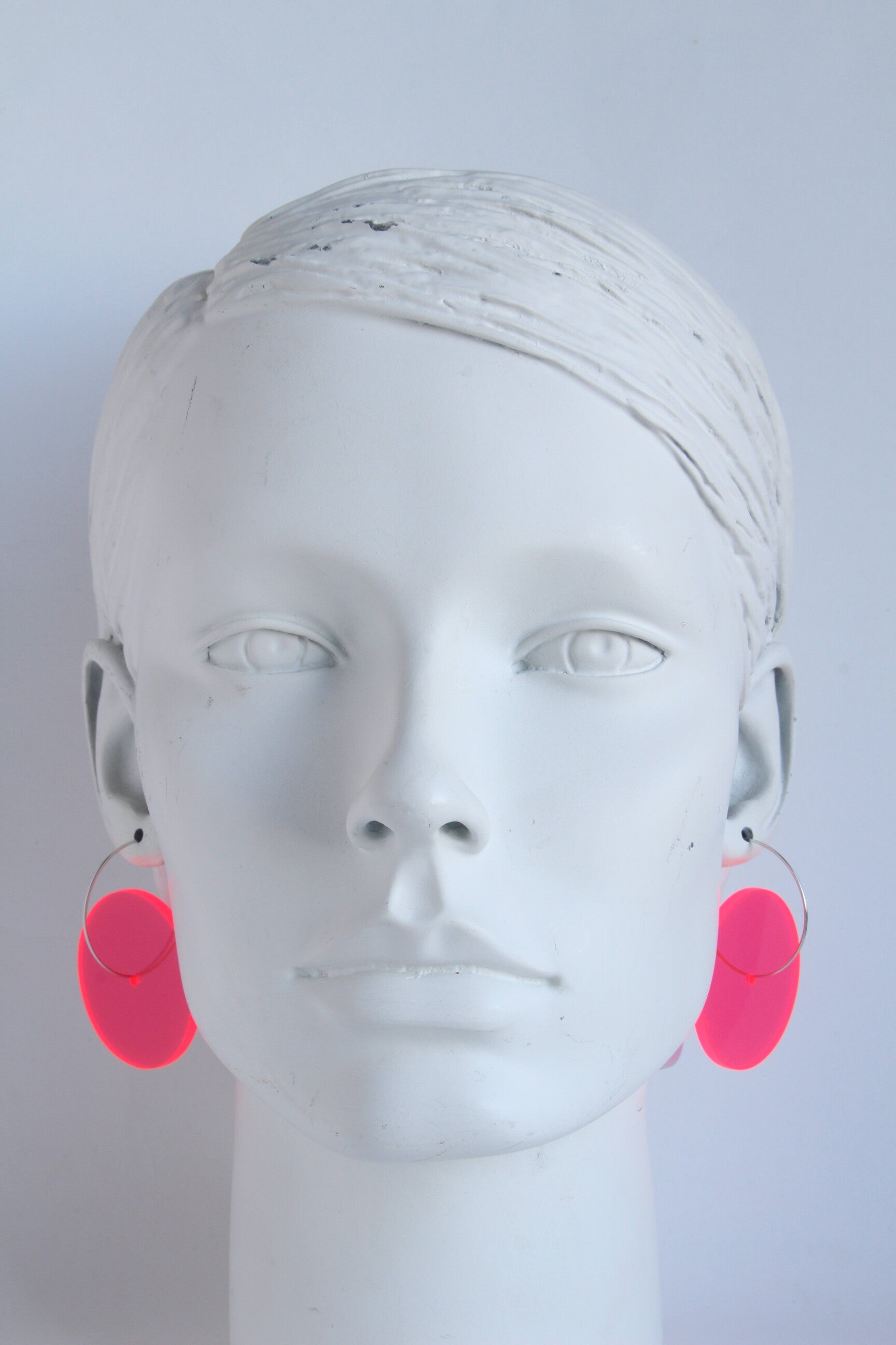 Oorbellen van fluor rood acrylaat aan oorringen van hypoallergeen rvs.