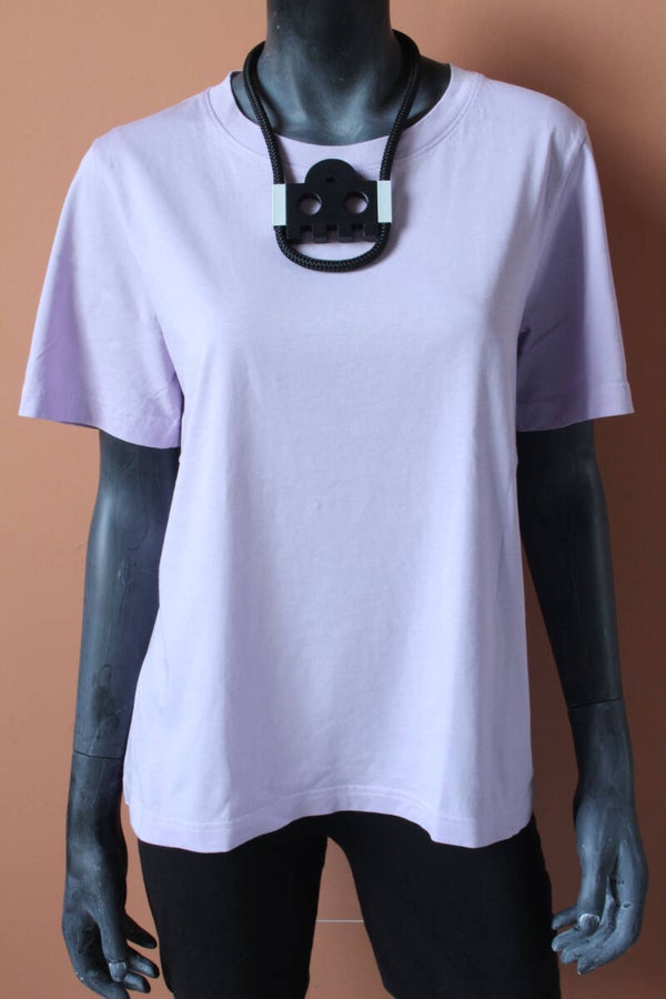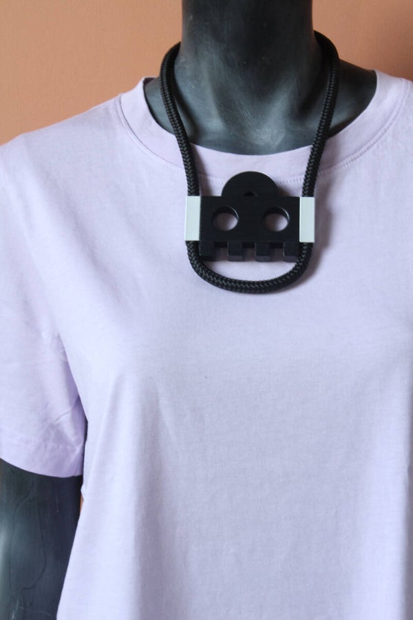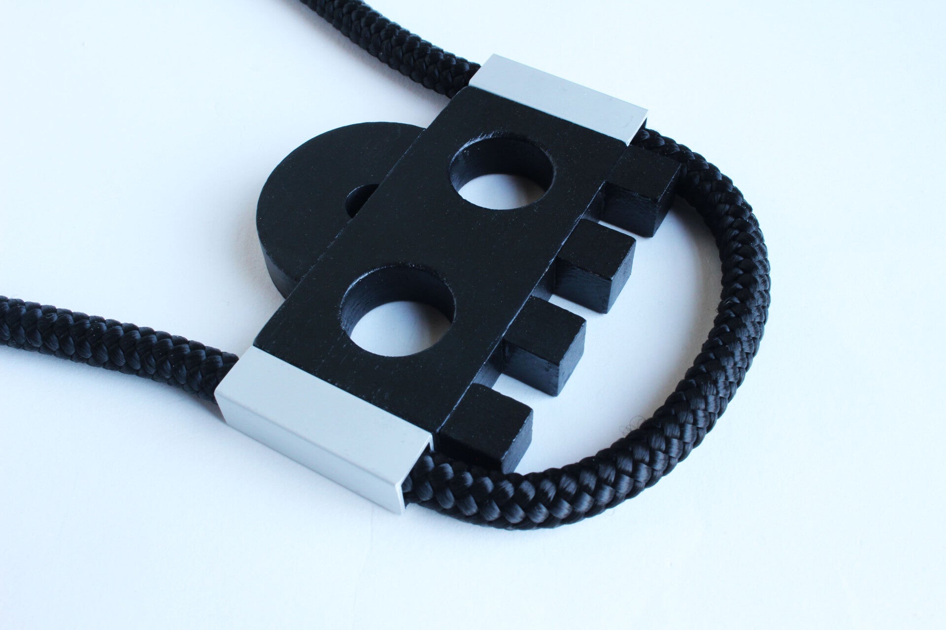 Ketting van geverfd beukenhout en aluminium aan een gevlochten koord. Bevestiging met een bajonet-magneetsluiting.