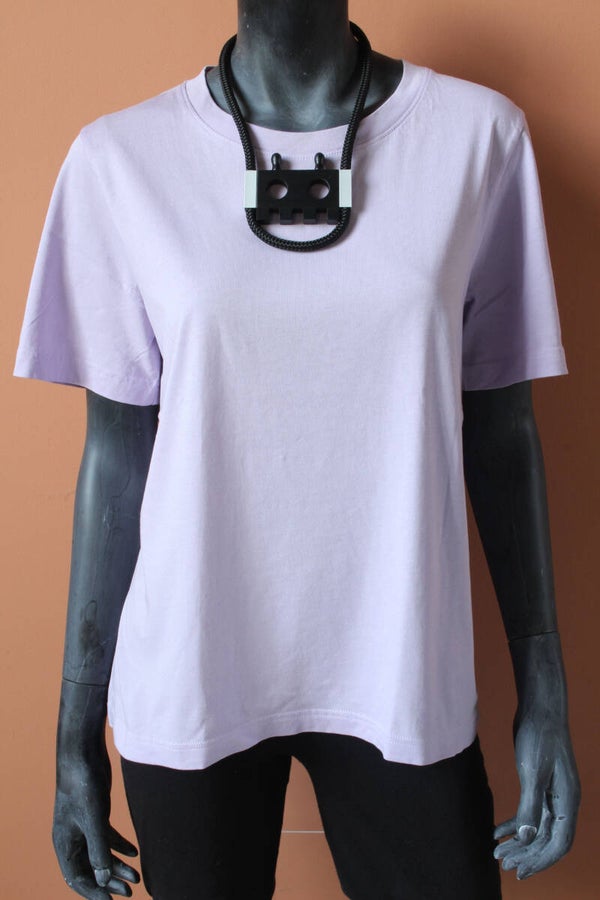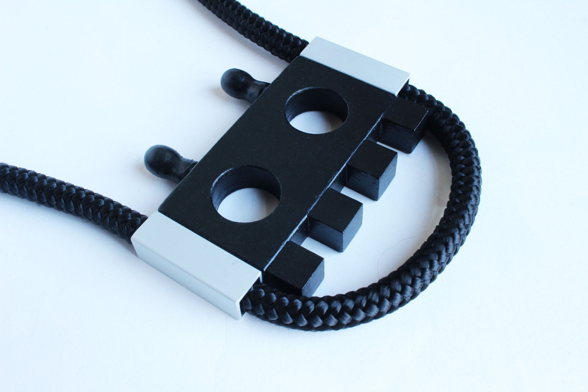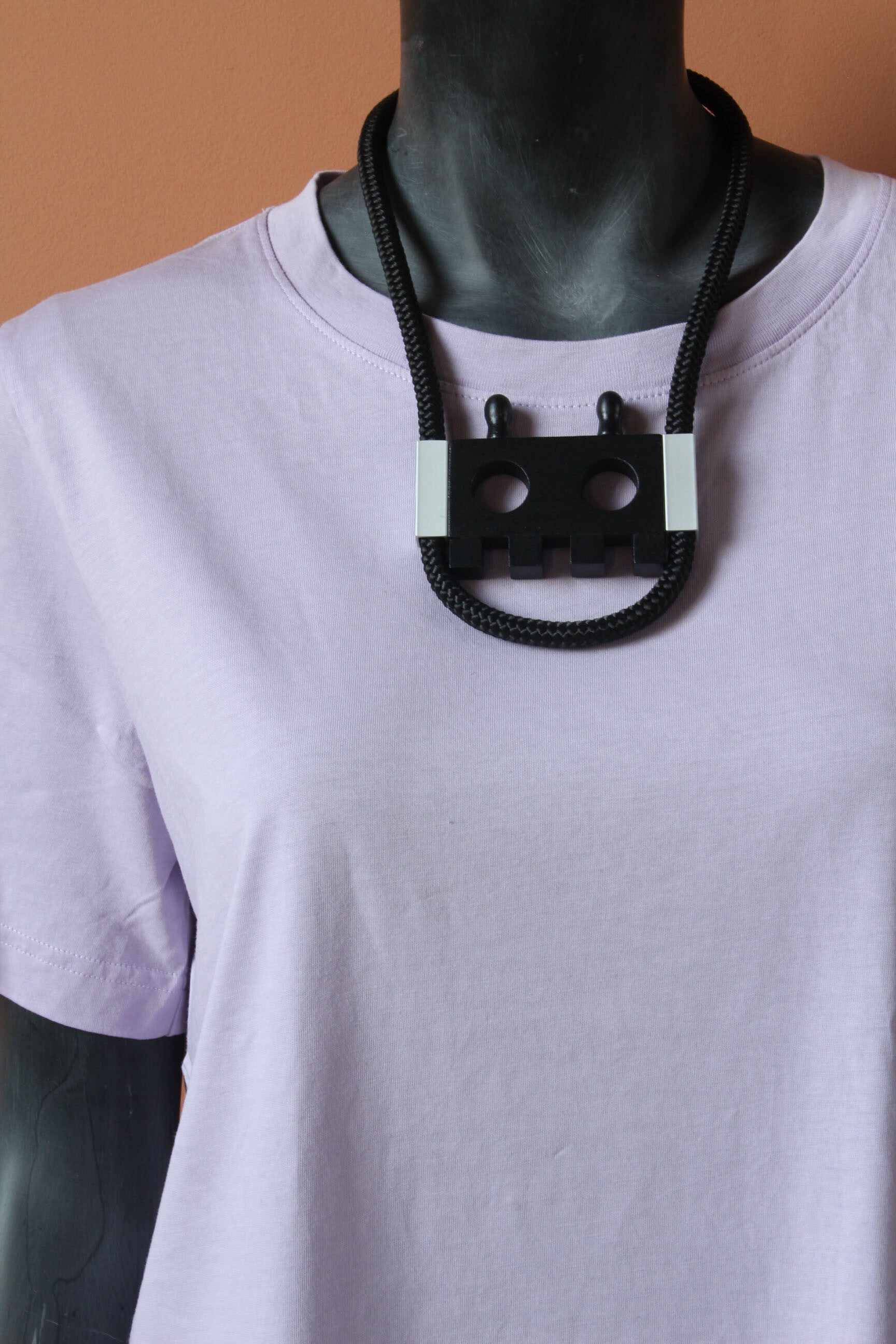 Ketting van geverfd beukenhout en aluminium aan een gevlochten koord. Bevestiging met een bajonet-magneetsluiting.