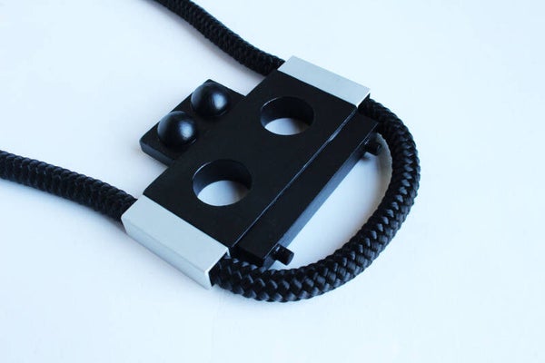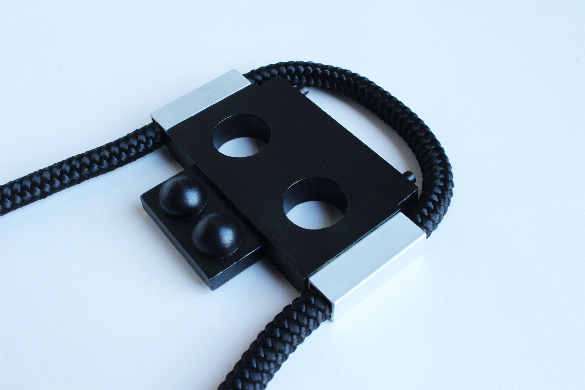 Ketting van geverfd beukenhout en aluminium aan een gevlochten koord. Bevestiging met een bajonet-magneetsluiting.