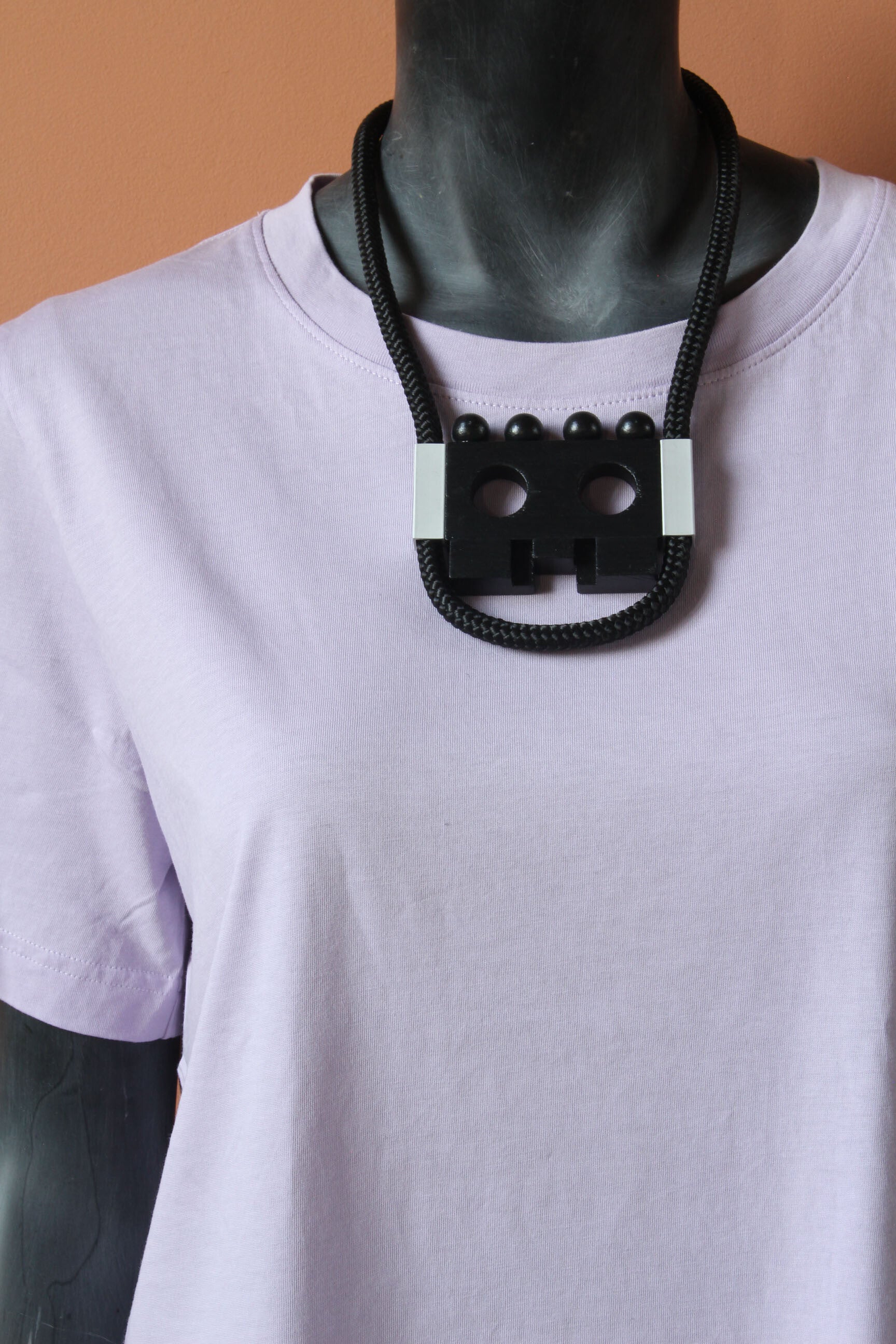 Ketting van geverfd beukenhout en aluminium aan een gevlochten koord. Bevestiging met een bajonet-magneetsluiting.