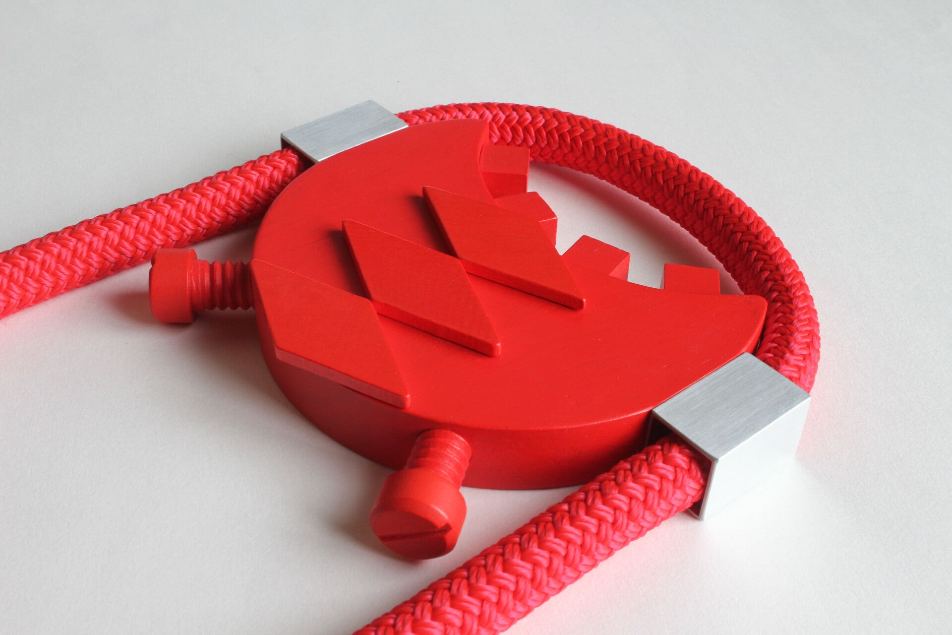 Ketting van geverfd beukenhout en aluminium aan een dubbelgevlochten koord. Bevestiging met een sterke magneetsluiting.