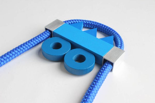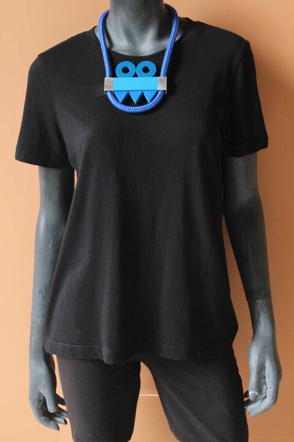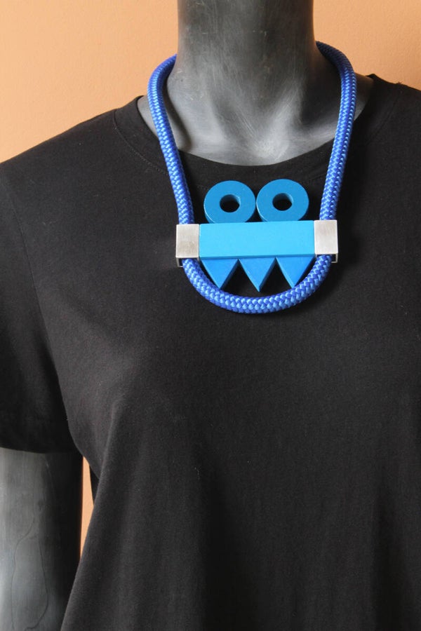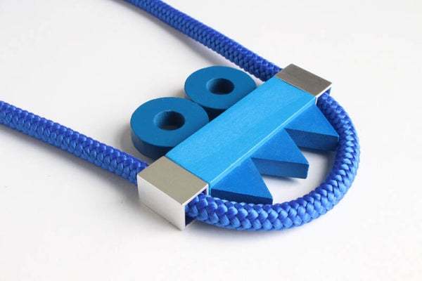 Ketting van geverfd beukenhout en aluminium aan een gevlochten koord. Bevestiging met een bajonet-magneetsluiting.