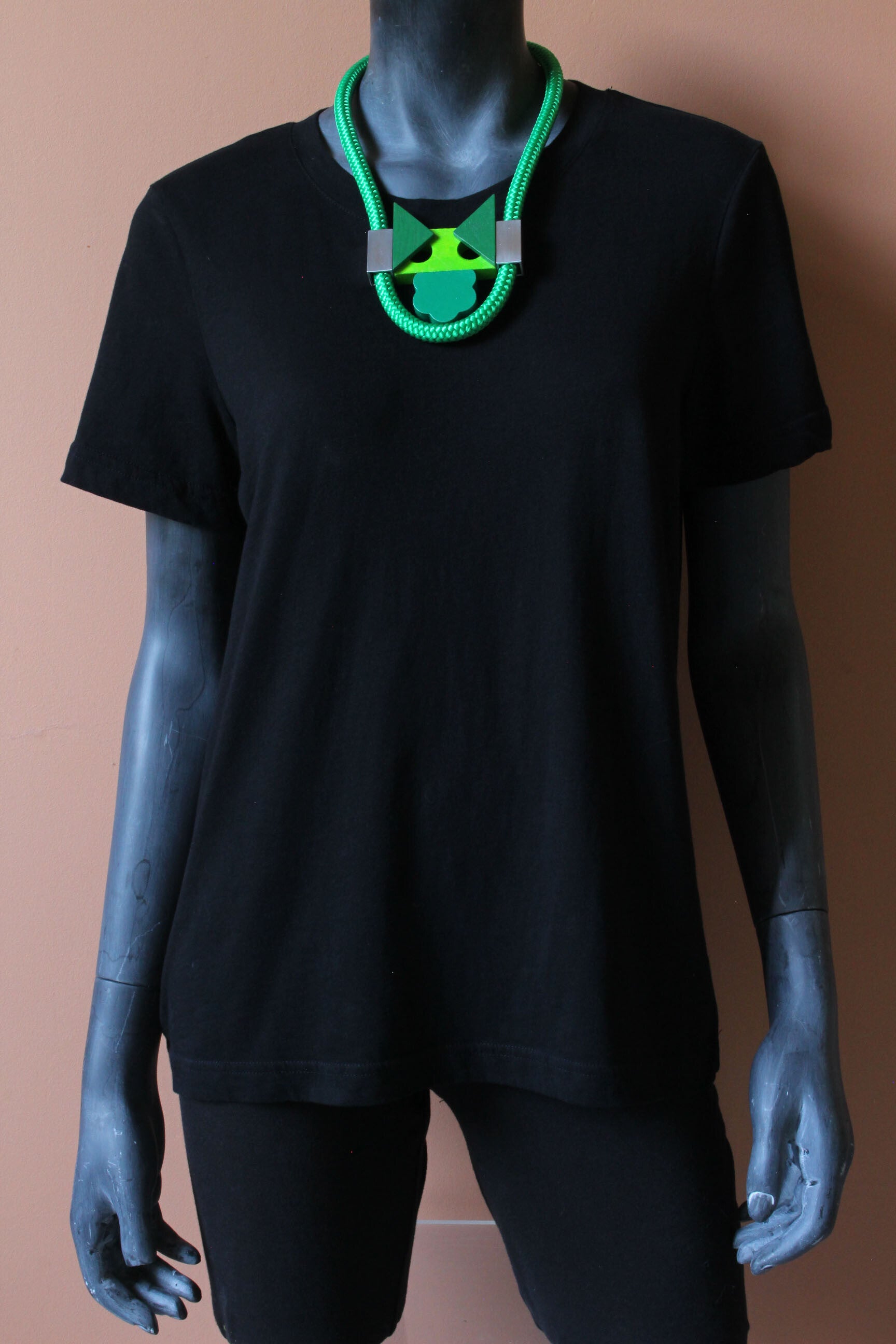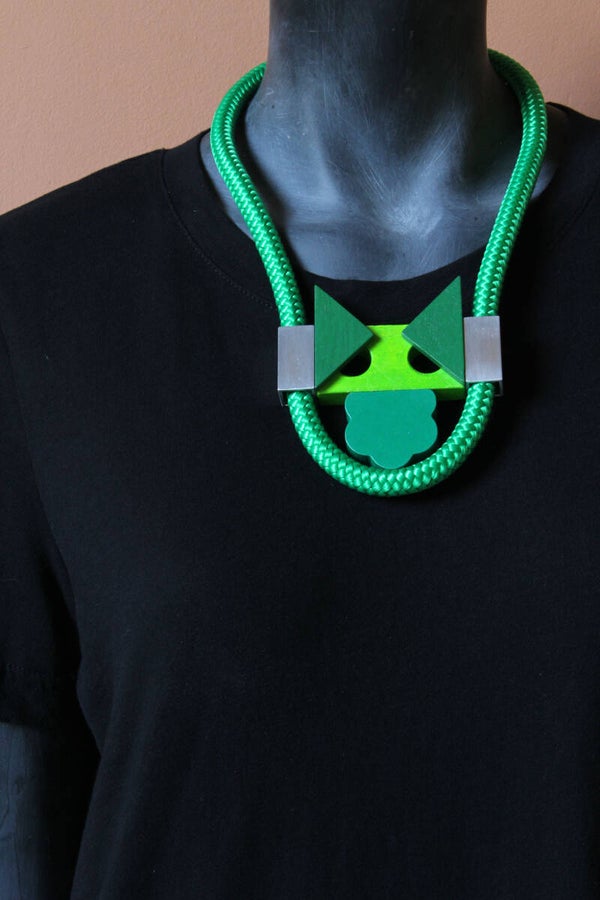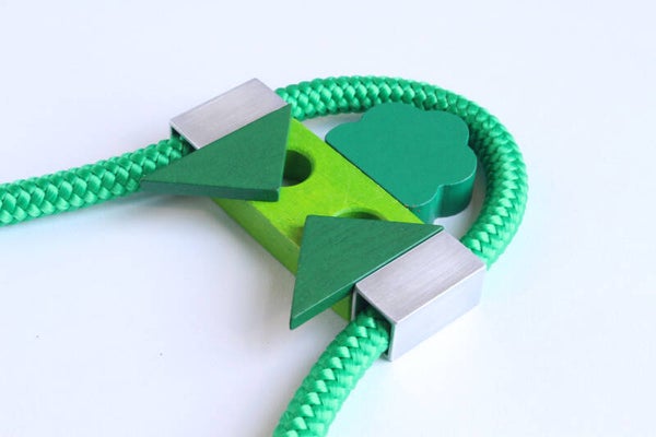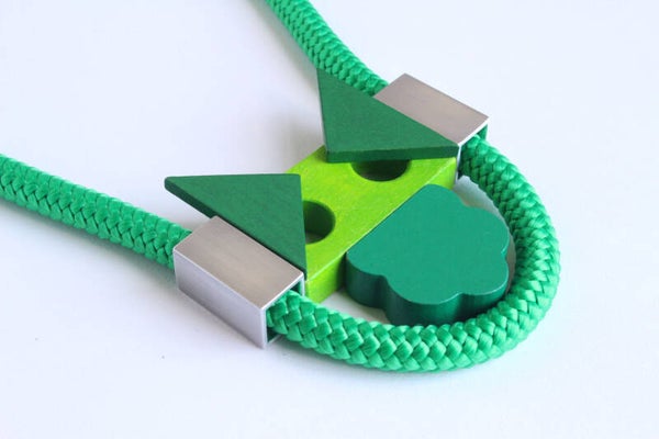 Ketting van geverfd beukenhout en aluminium aan een gevlochten koord. Bevestiging met een bajonet-magneetsluiting.