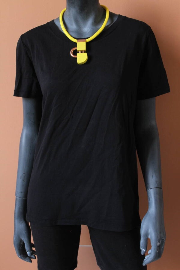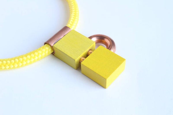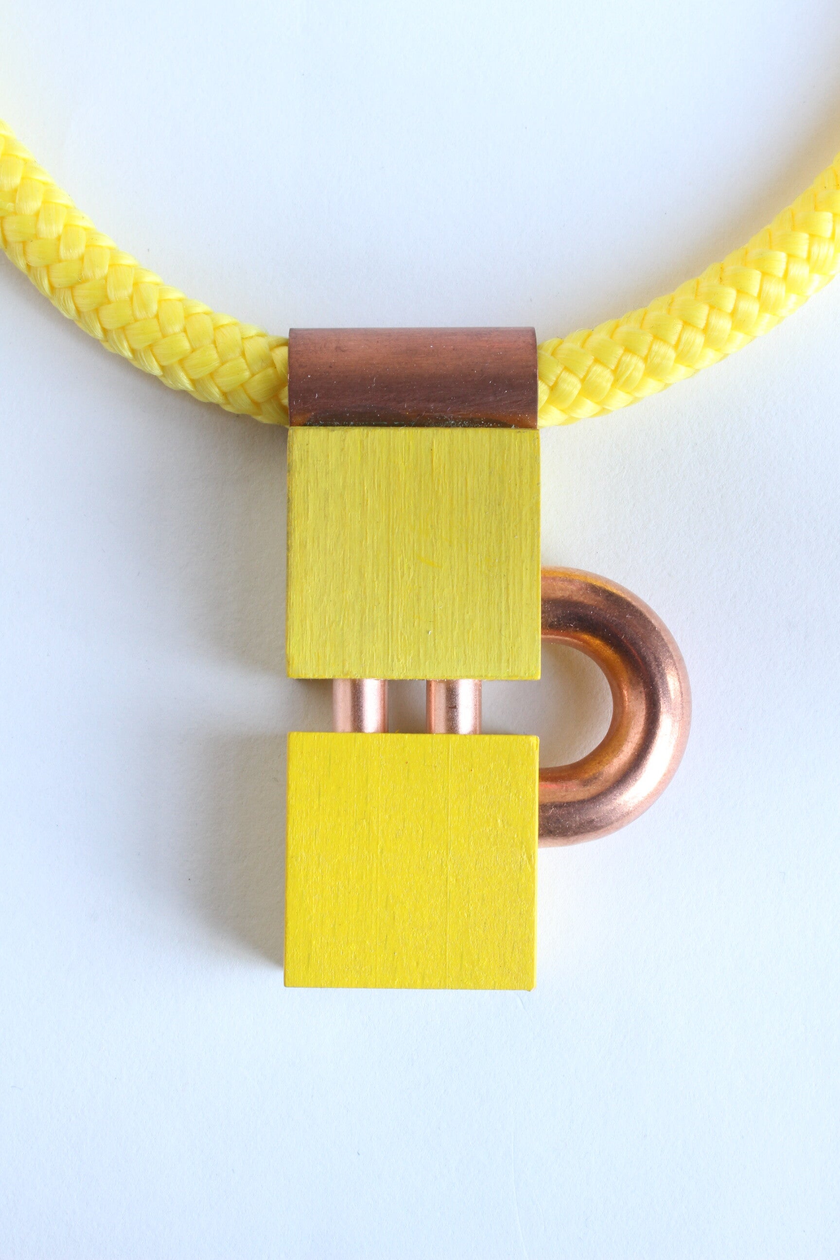 Ketting van geverfd beukenhout en koper aan een gevlochten koord. Bevestiging met een bajonet-magneetsluiting.