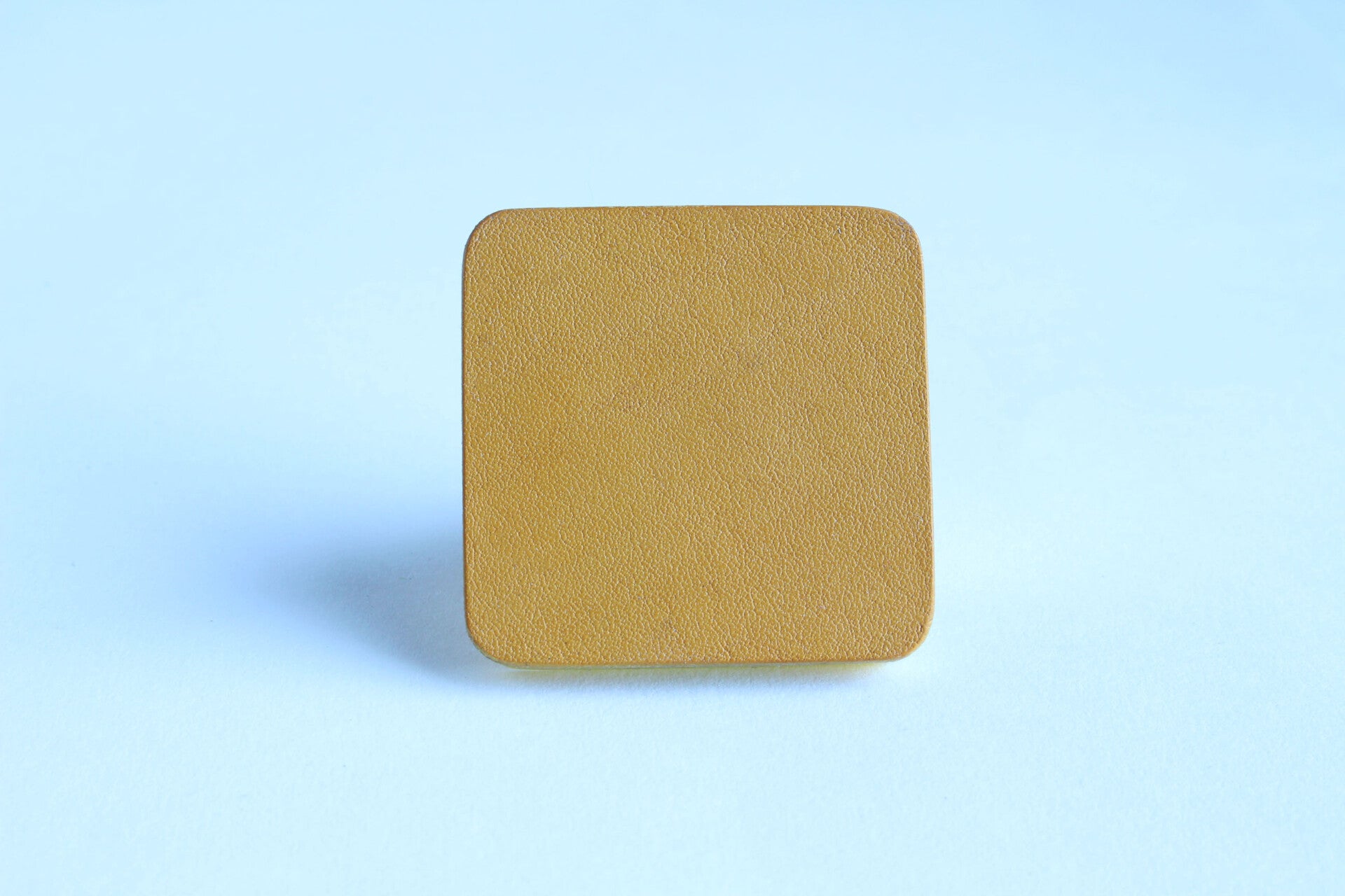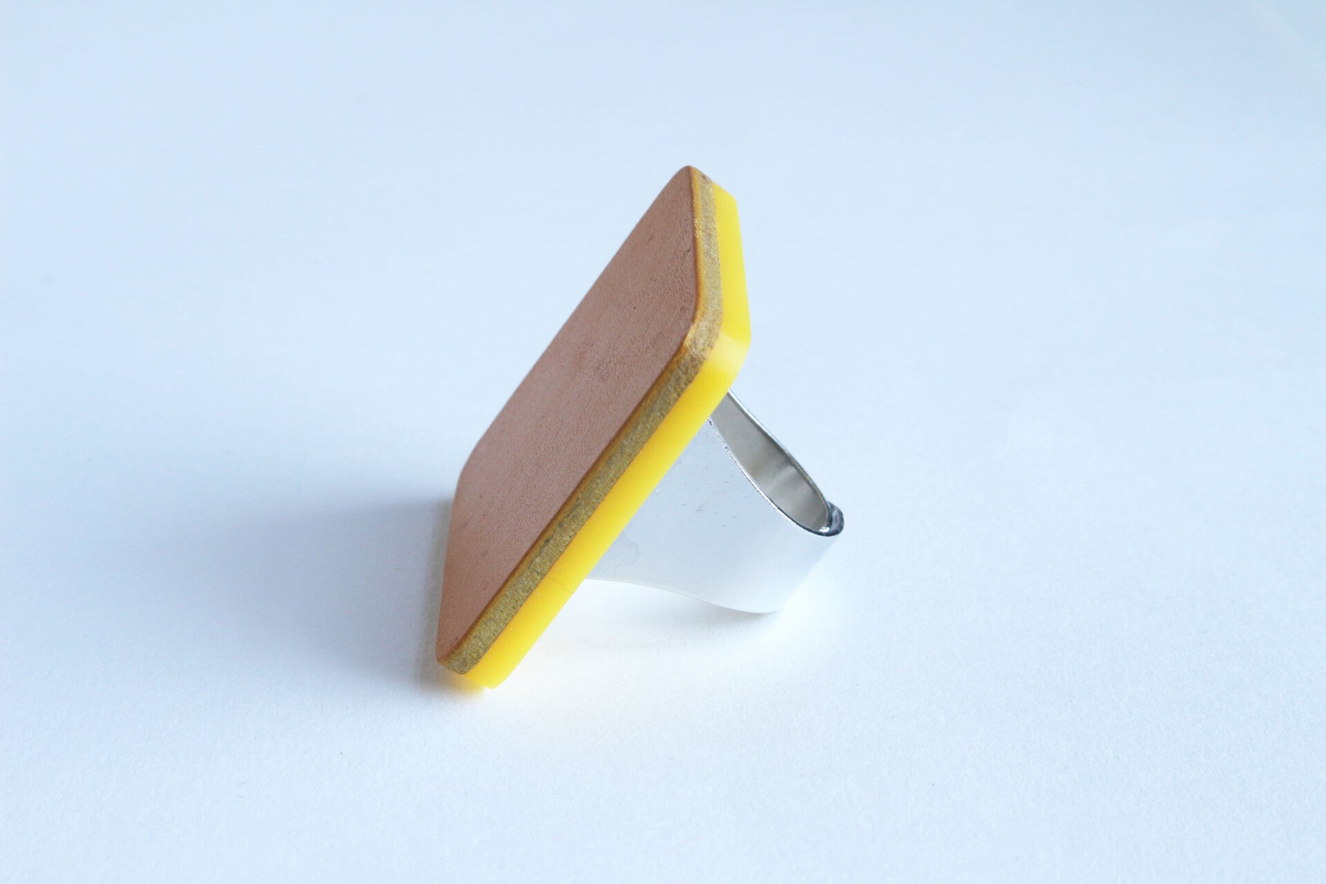 Verstelbare metalen ring van geel acrylaat gelamineerd met geel tuigleer.