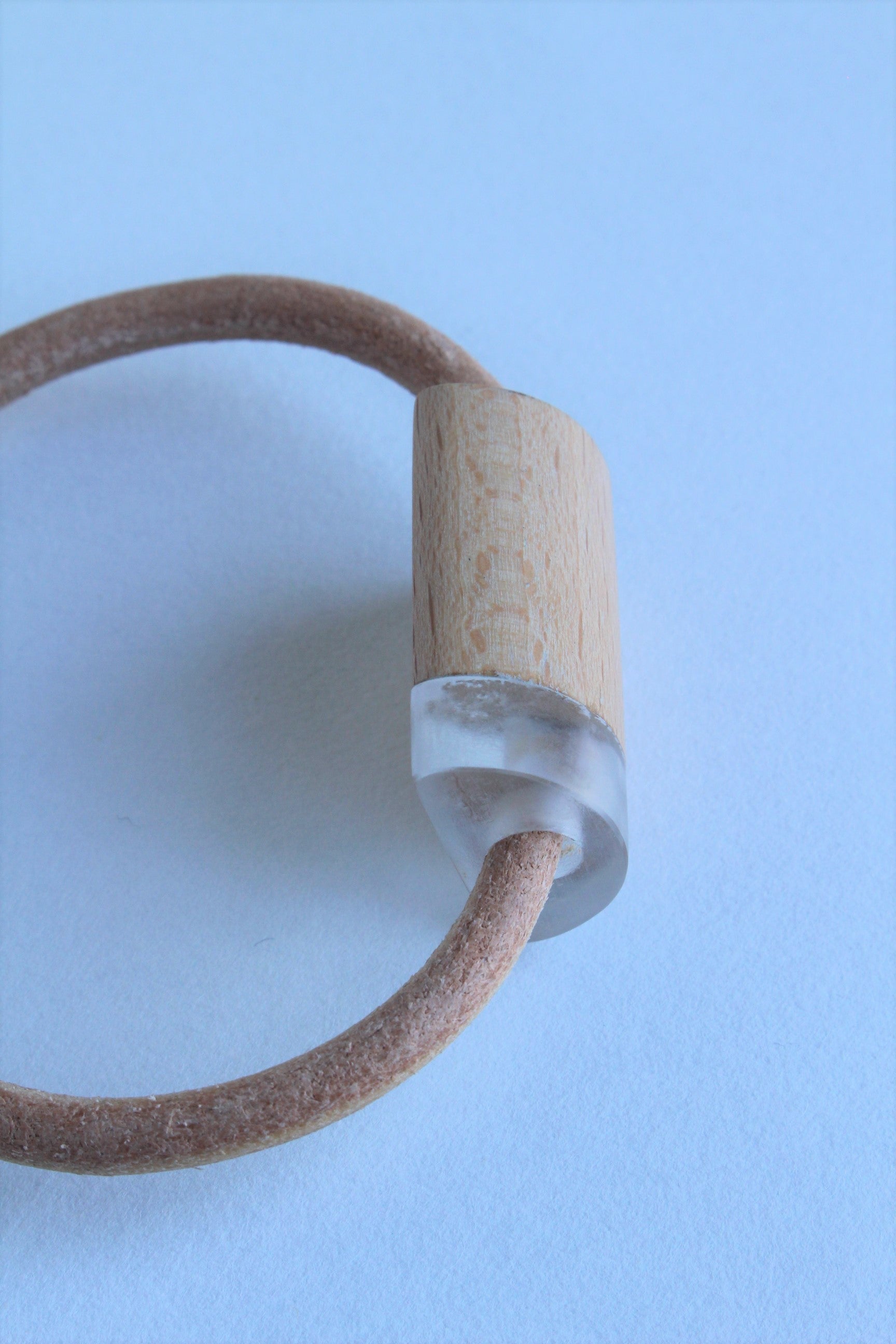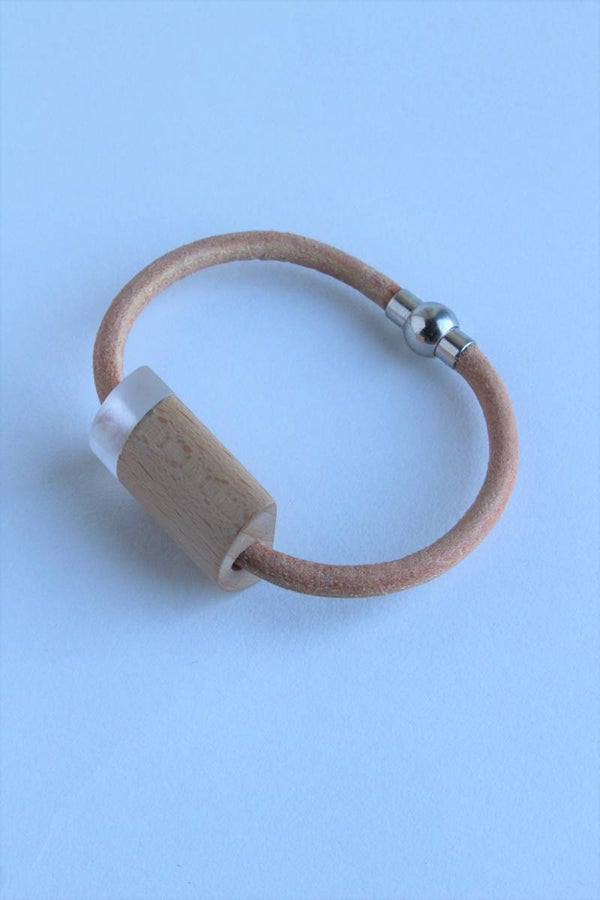 Armband van beukenhout en transparant acrylaat aan een koord van leder. De armand heeft een magnetische sluiting en is voorzien van een wax om het materiaal te beschermen tegen vocht en vuil.