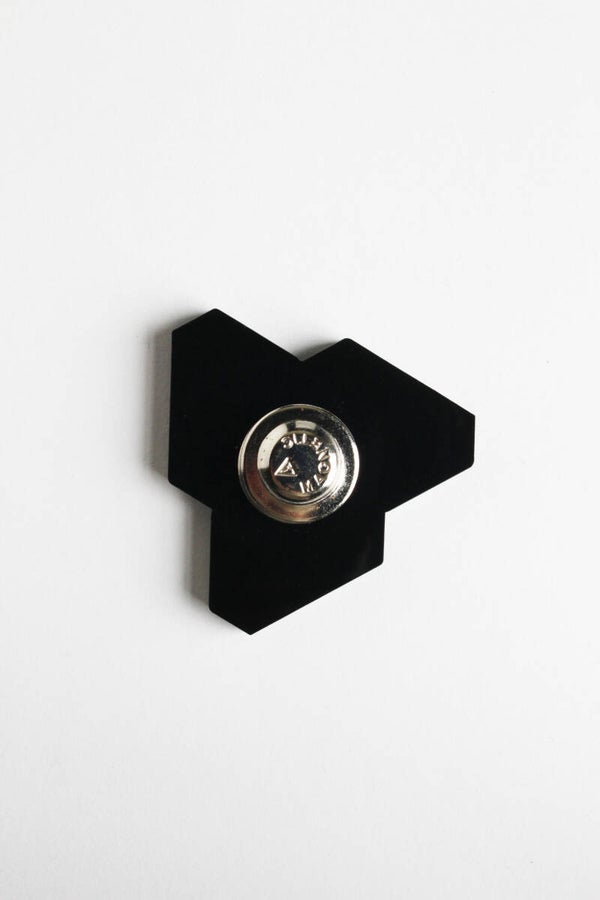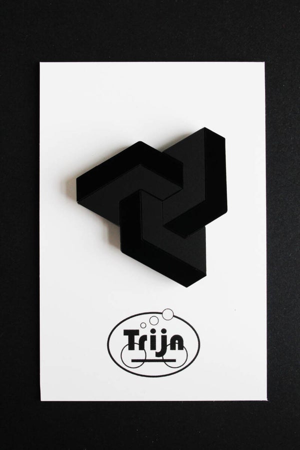 Broche "Schuivende figuur" van glanzend en mat zwart acrylaat.