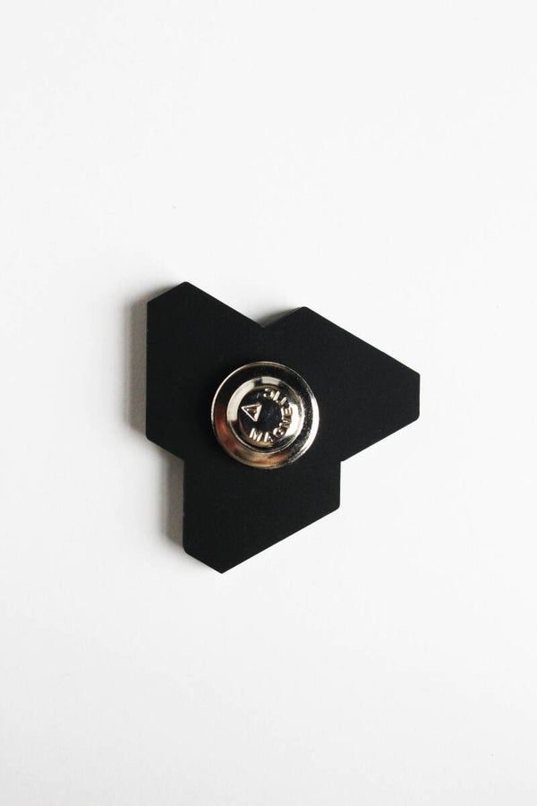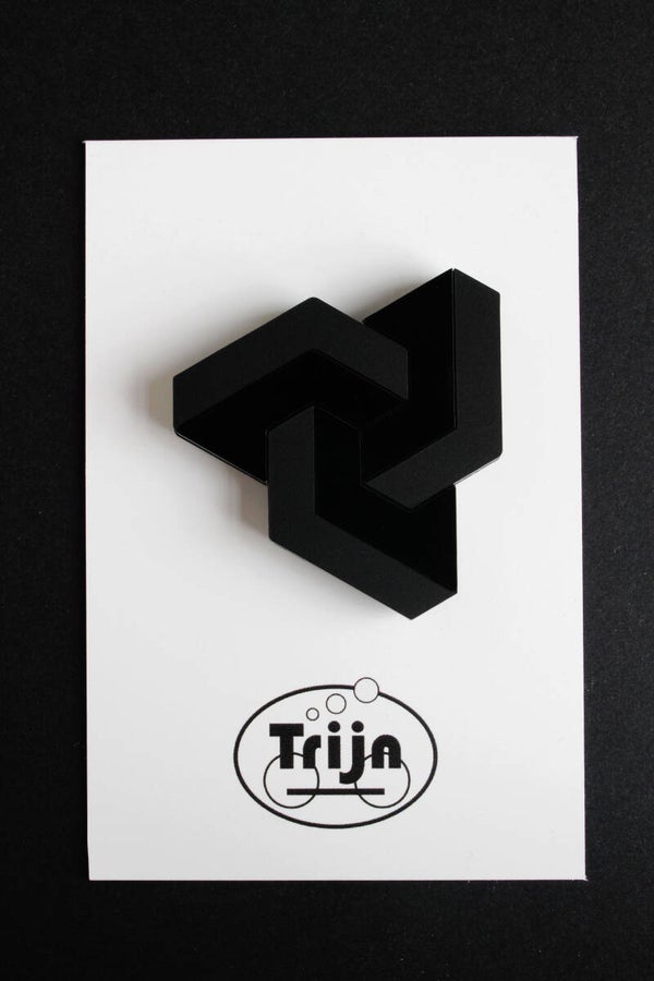 Broche "Schuivende figuur" van mat en glanzend zwart acrylaat.