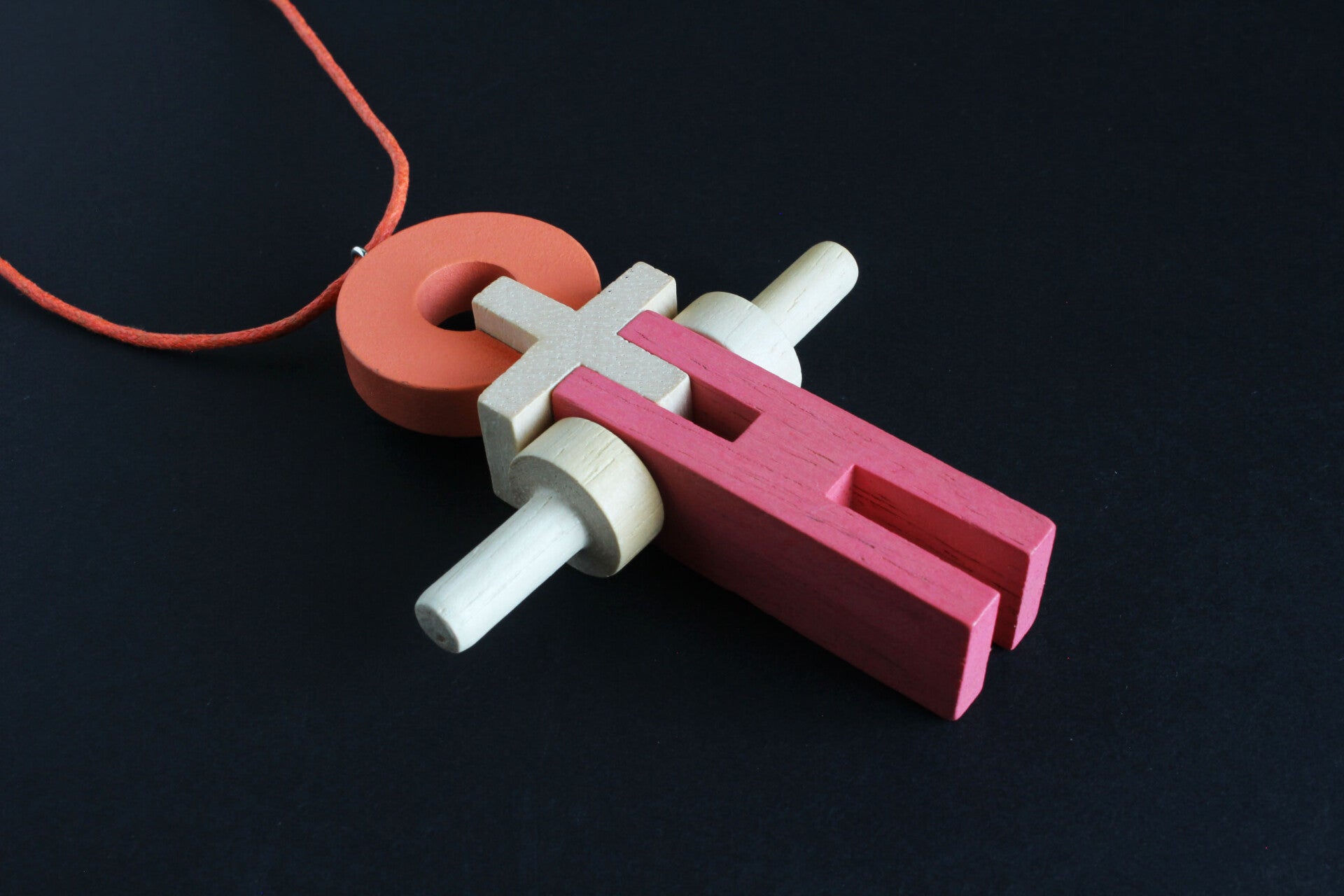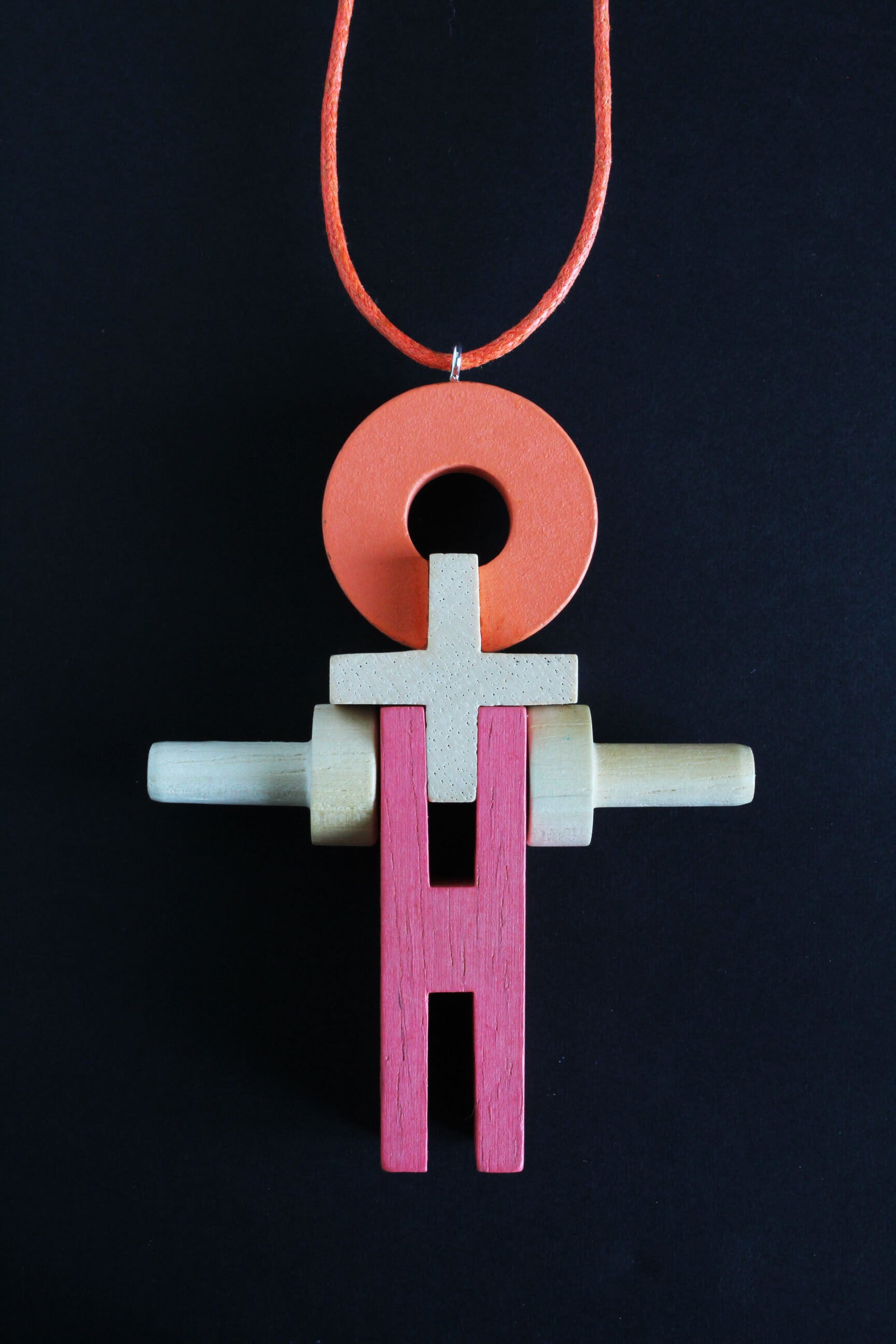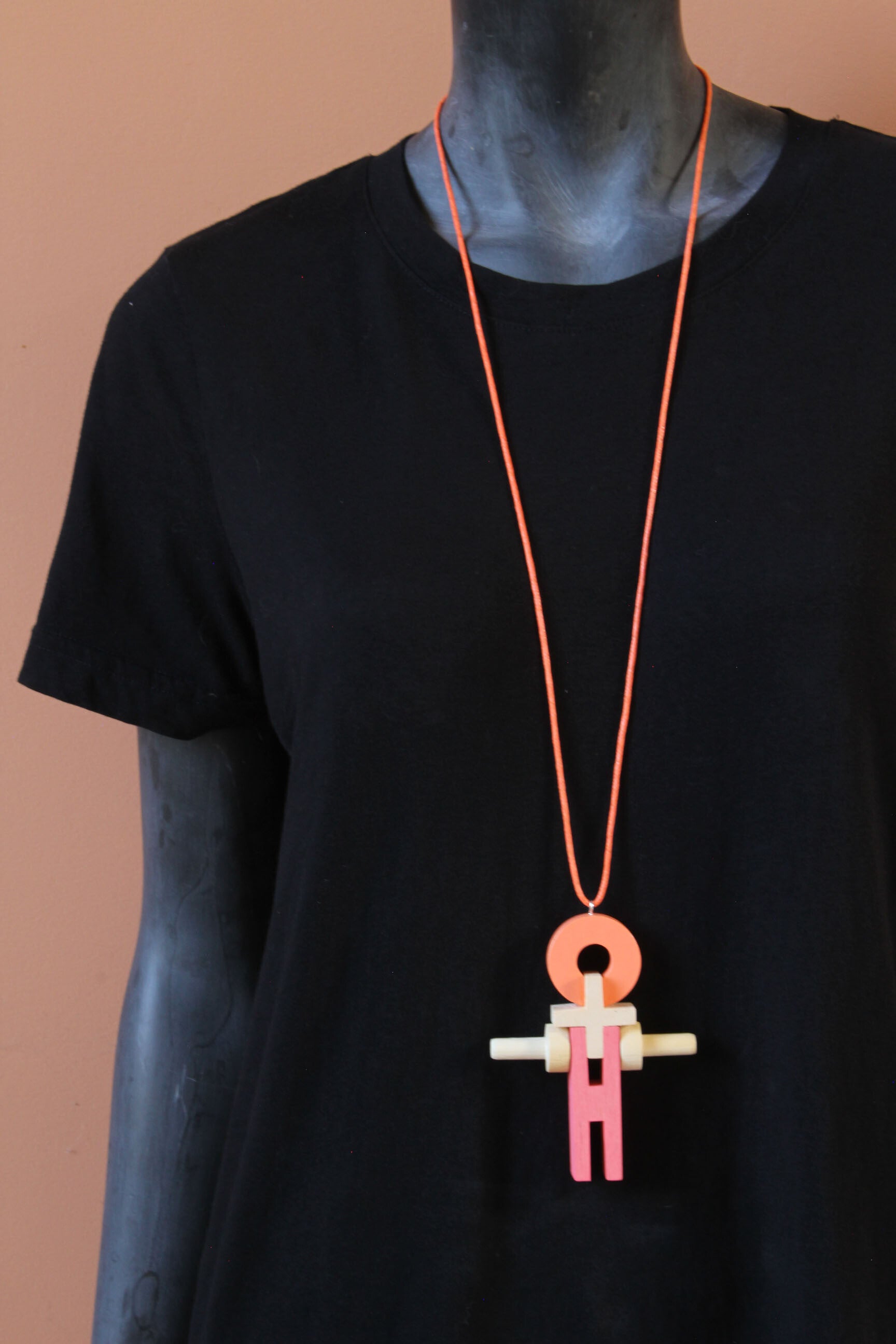 Ketting van blank en geverfd hout aan een gewaxt katoenkoord. Het koord is zelf op elke lengte vast te maken of in te korten.
