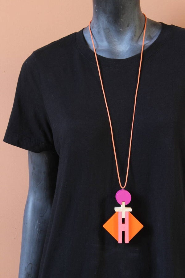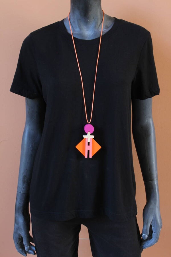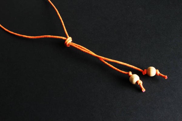 Ketting van blank en geverfd hout aan een gewaxt katoenkoord. Het koord is zelf op elke lengte vast te maken of in te korten.