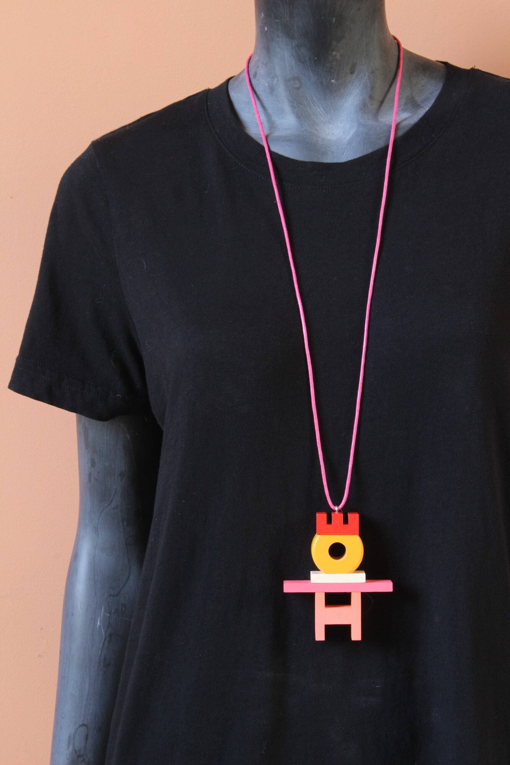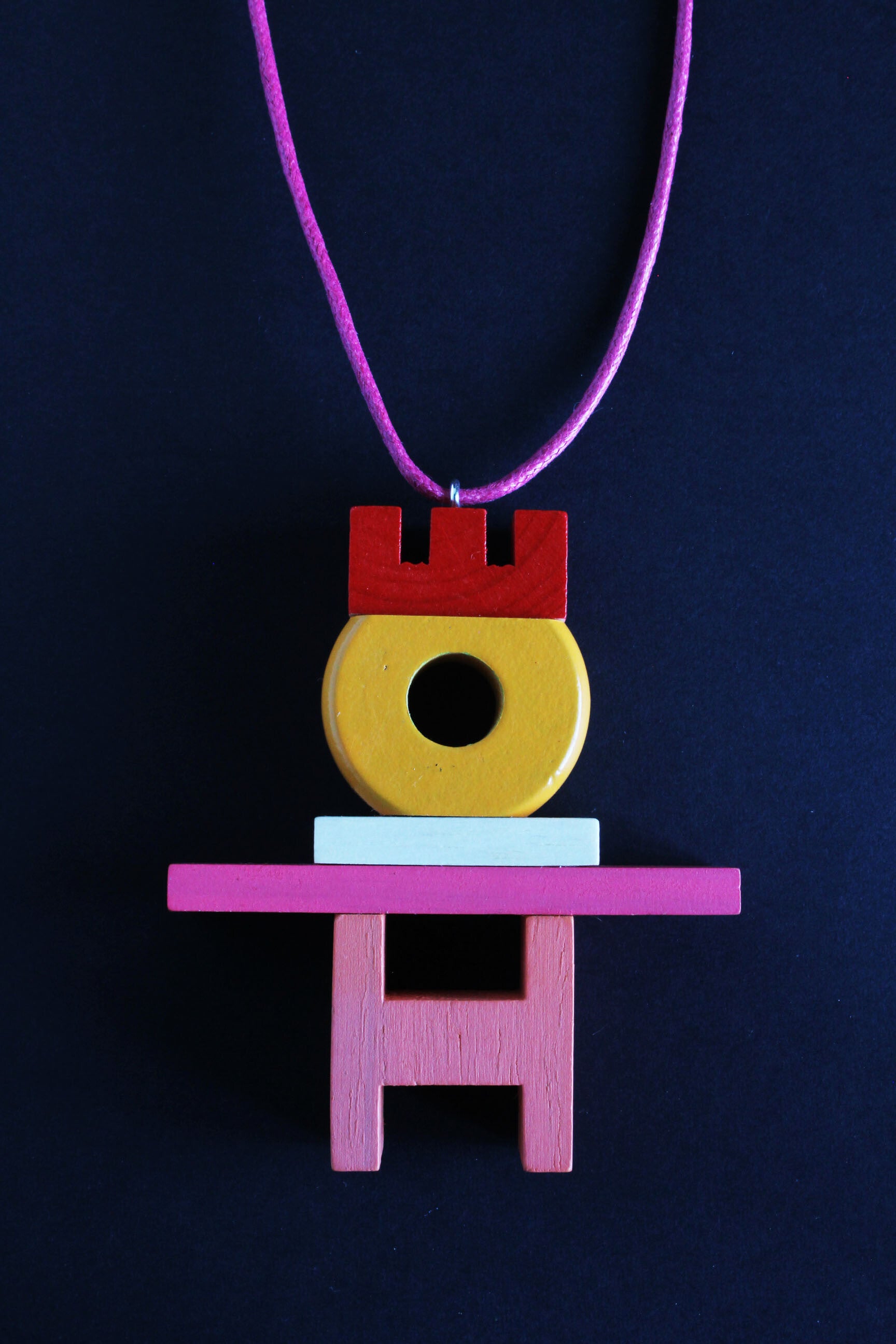 Ketting van blank en geverfd hout aan een gewaxt katoenkoord. Het koord is zelf op elke lengte vast te maken of in te korten.