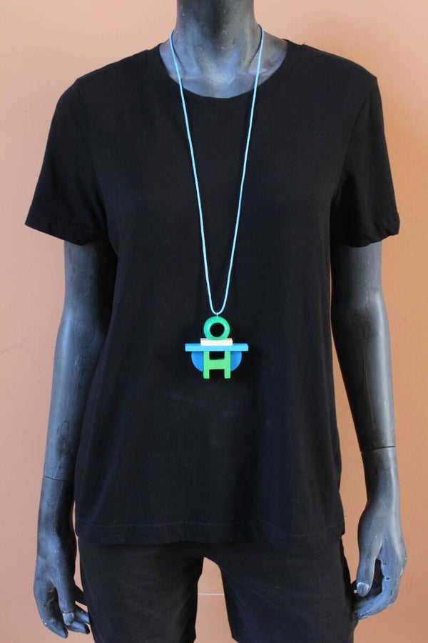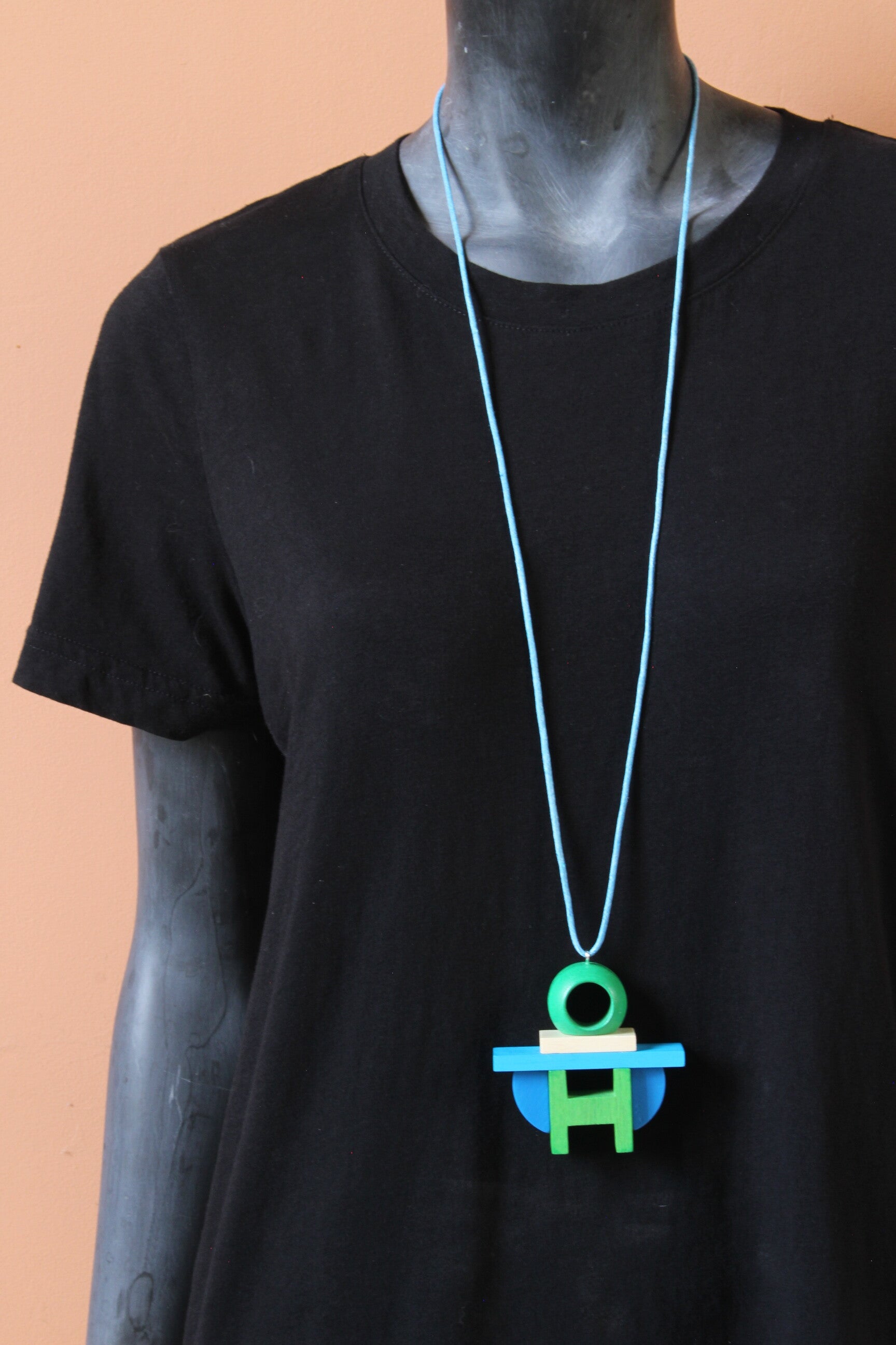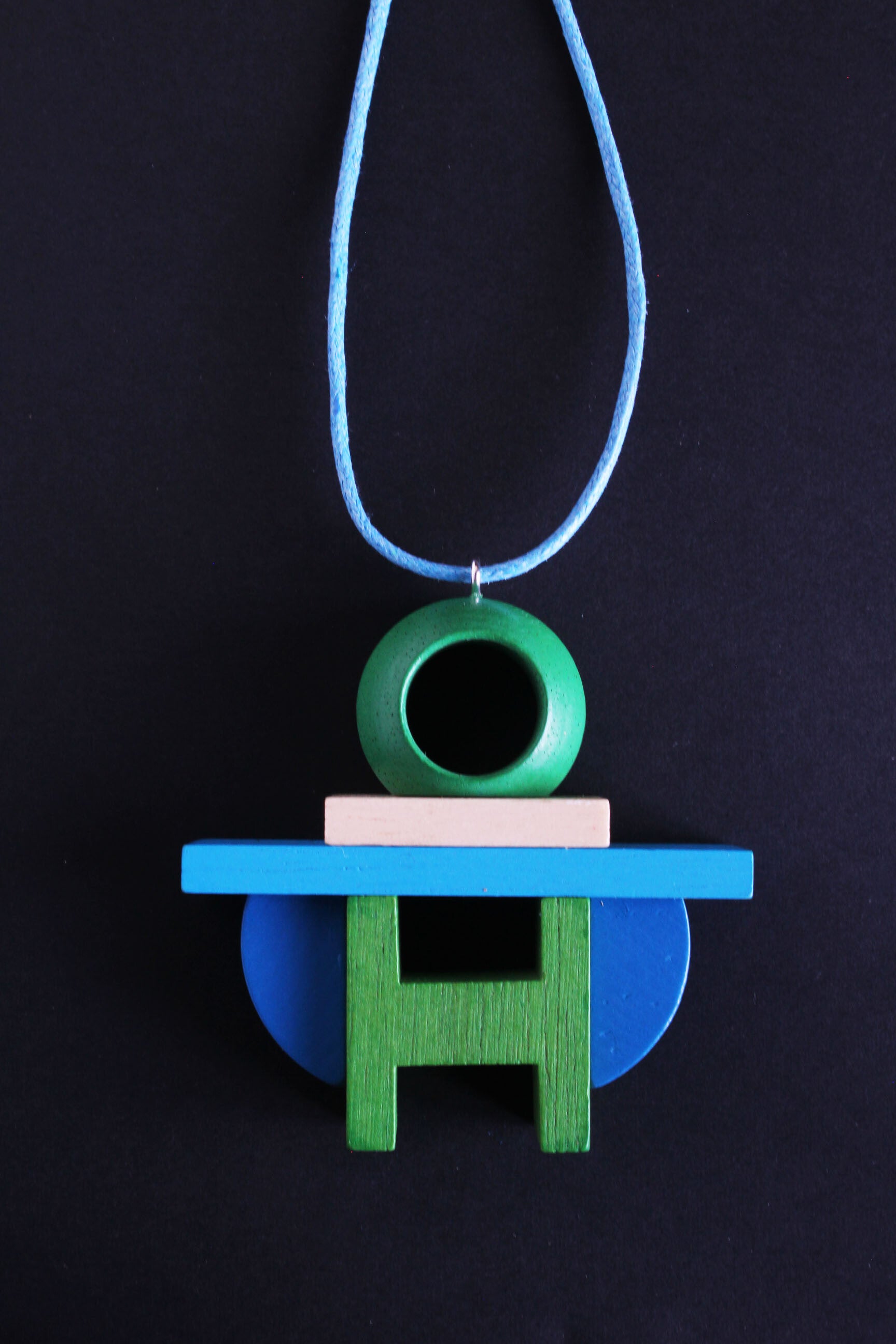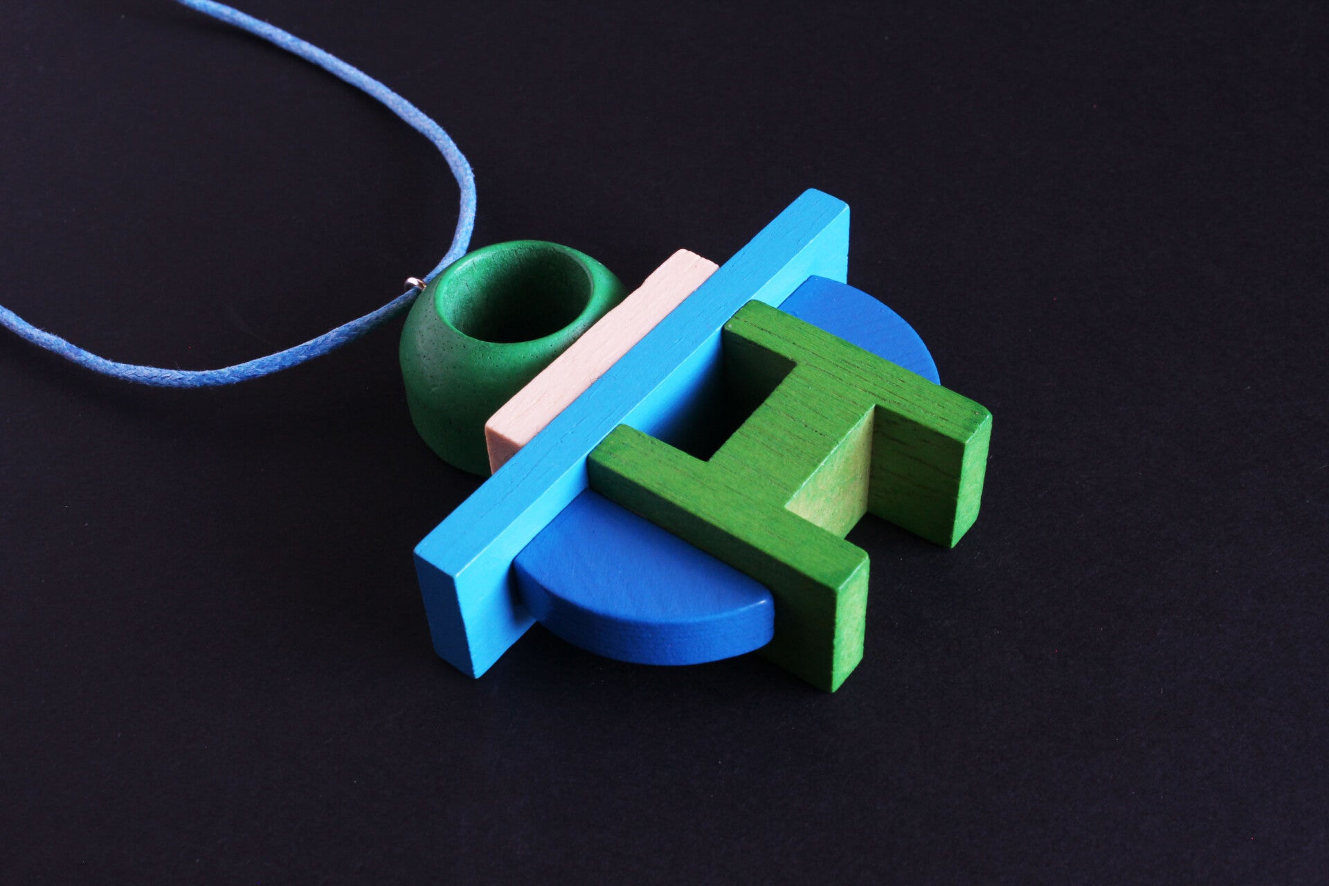 Ketting van blank en geverfd hout aan een gewaxt katoenkoord. Het koord is zelf op elke lengte vast te maken of in te korten.