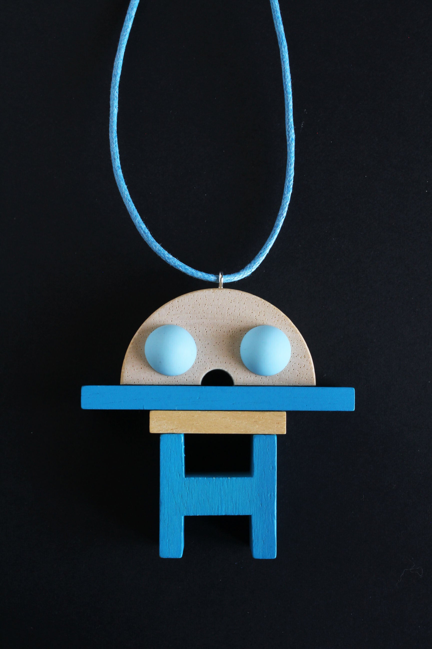 Ketting van blank en geverfd hout en kunststof aan een gewaxt katoenkoord. Het koord is zelf op elke lengte vast te maken of in te korten.