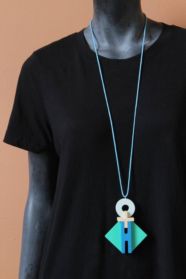 Ketting van blank en geverfd hout aan een gewaxt katoenkoord. Het koord is zelf op elke lengte vast te maken of in te korten.
