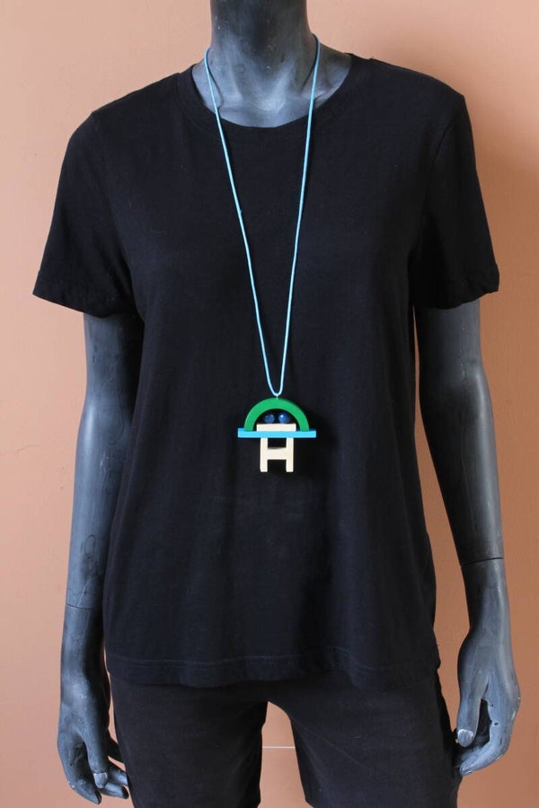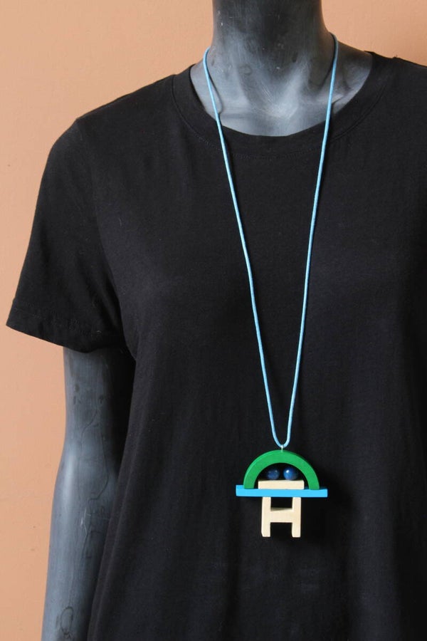 Ketting van blank en geverfd hout aan een gewaxt katoenkoord. Het koord is zelf op elke lengte vast te maken of in te korten.