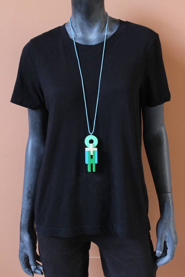 Ketting van blank en geverfd hout aan een gewaxt katoenkoord. Het koord is zelf op elke lengte vast te maken of in te korten.