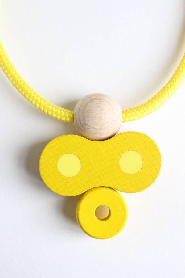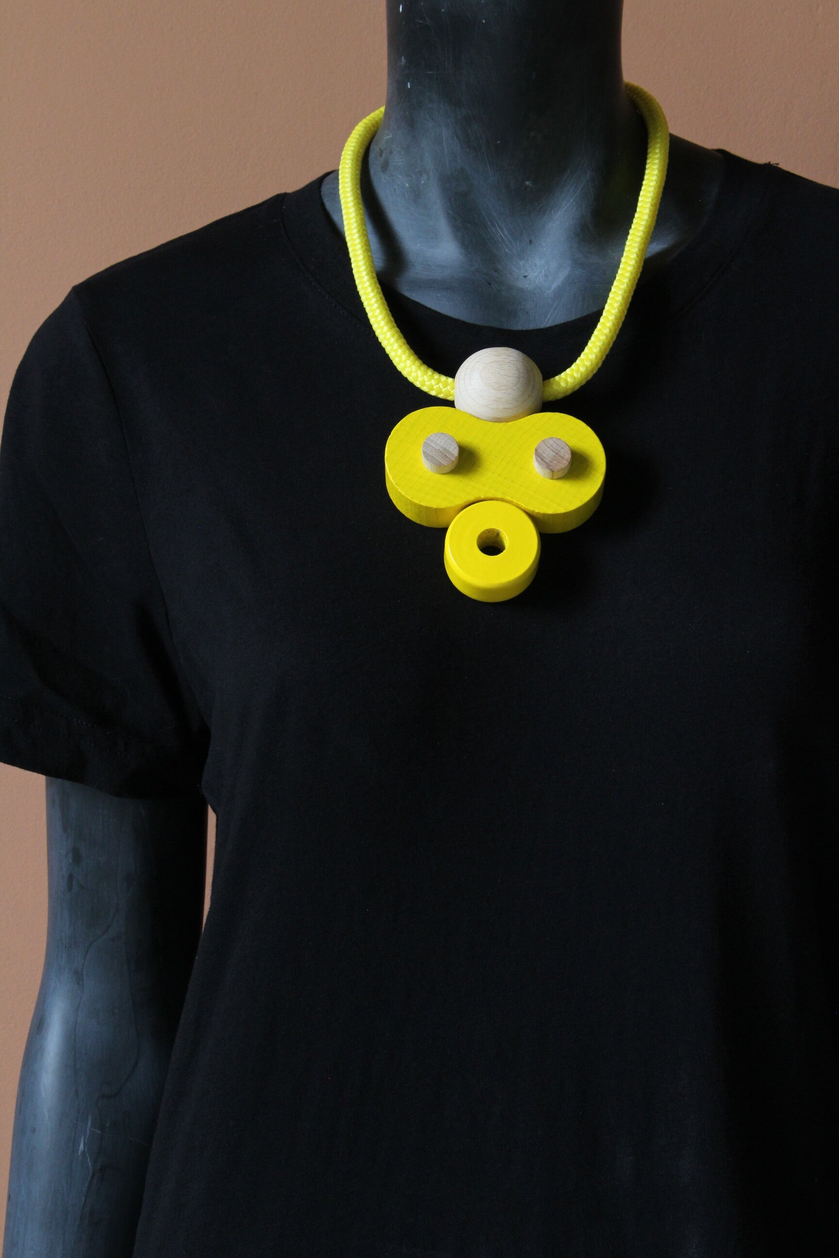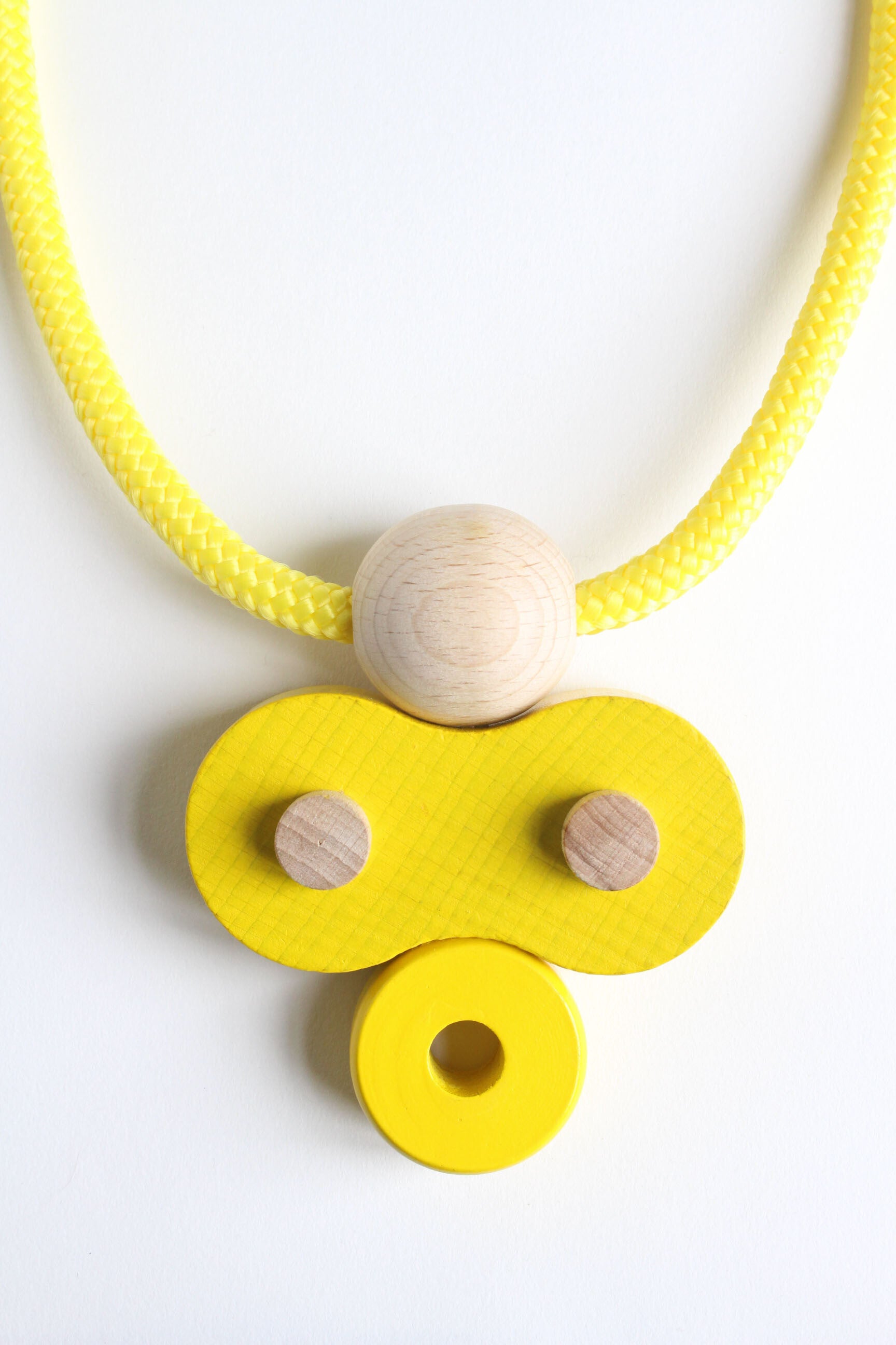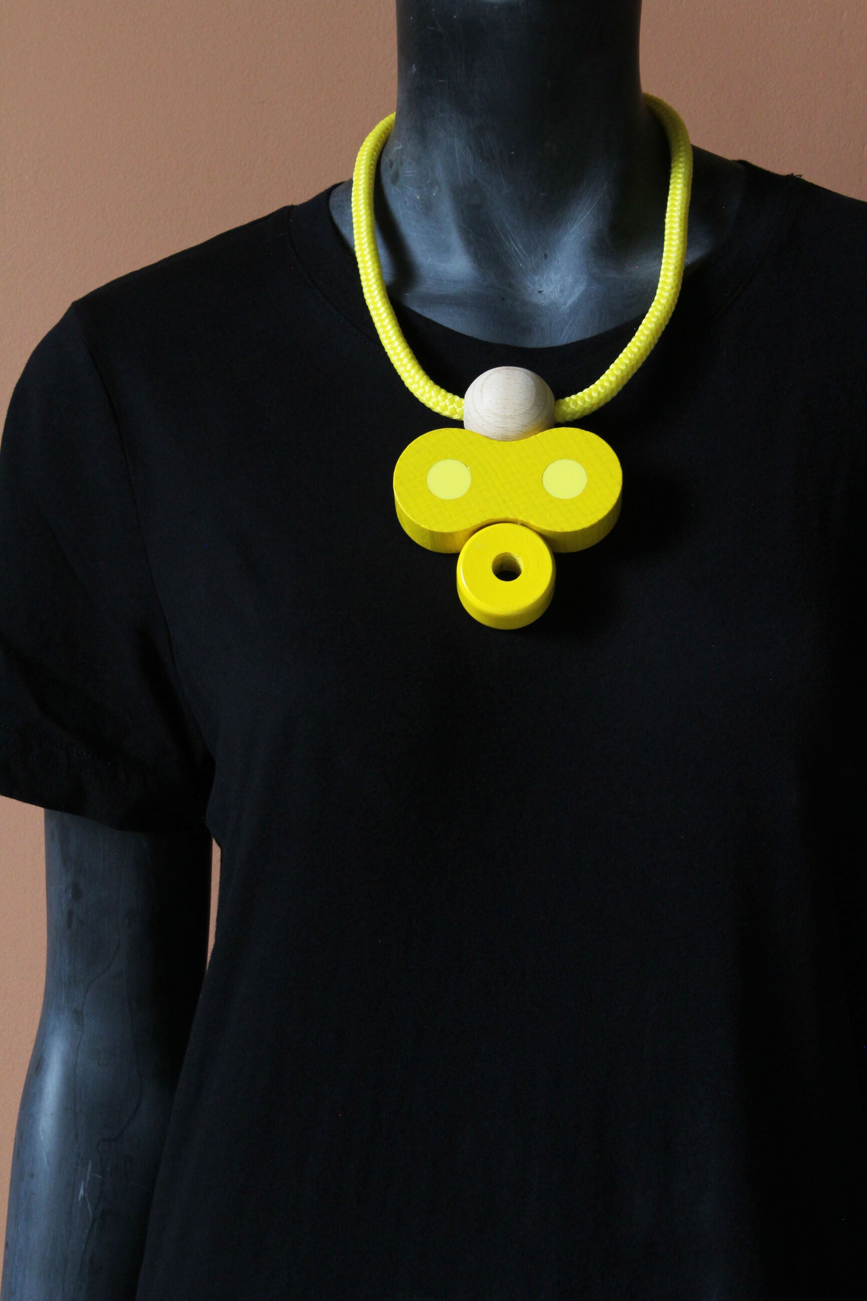 Ketting van blank en geverfd beukenhout en acrylaat aan een dubbelgevlochten koord. Bevestiging met een bajonet- magneetsluiting.