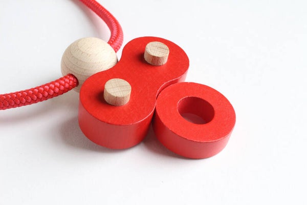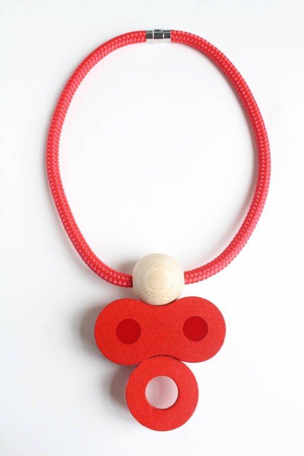 Ketting van blank en geverfd beukenhout en acrylaat aan een dubbelgevlochten koord. Bevestiging met een bajonet- magneetsluiting.