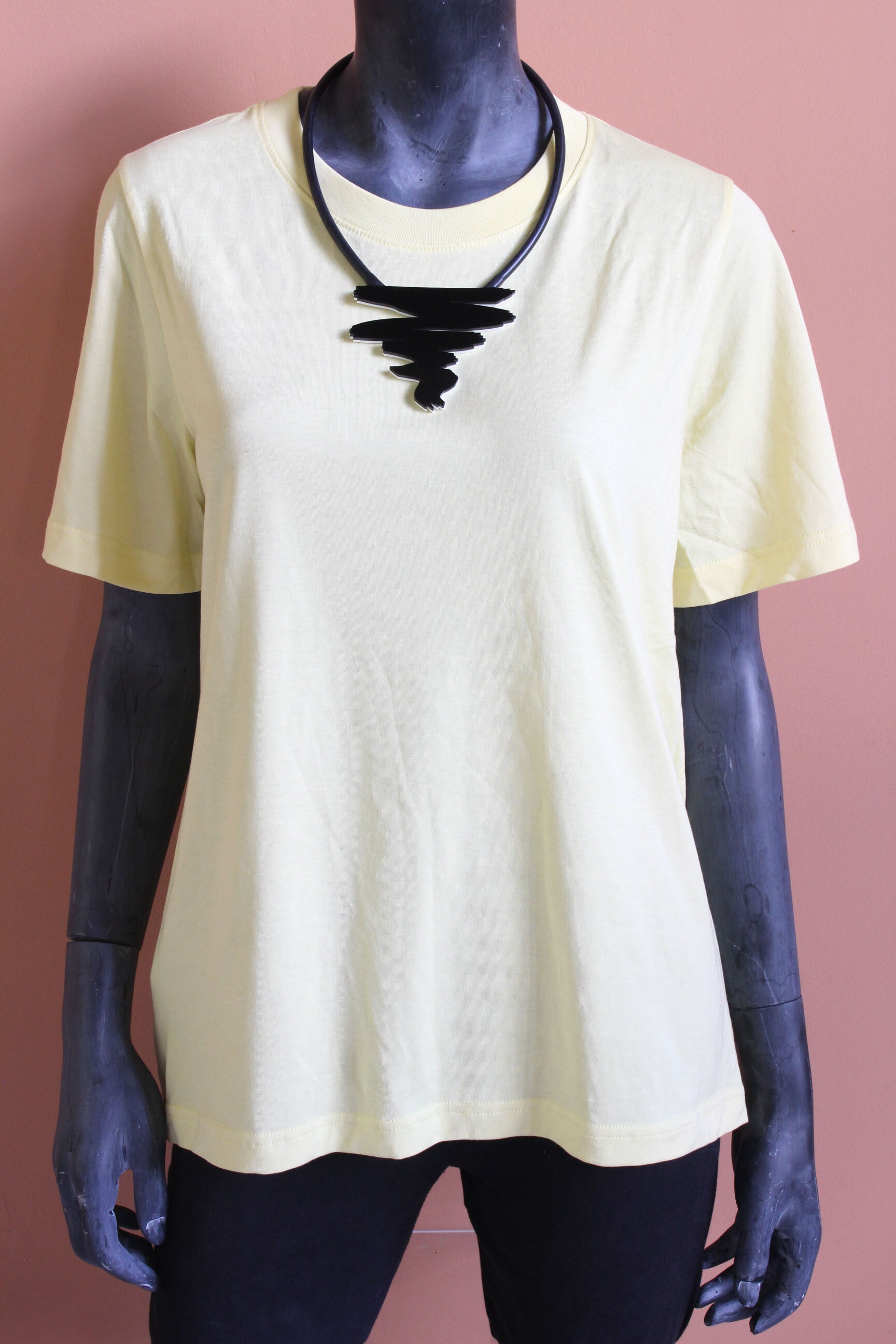 Ketting van zwart en wit acrylaat aan rubber koord. De ketting is tweezijdig te dragen.
