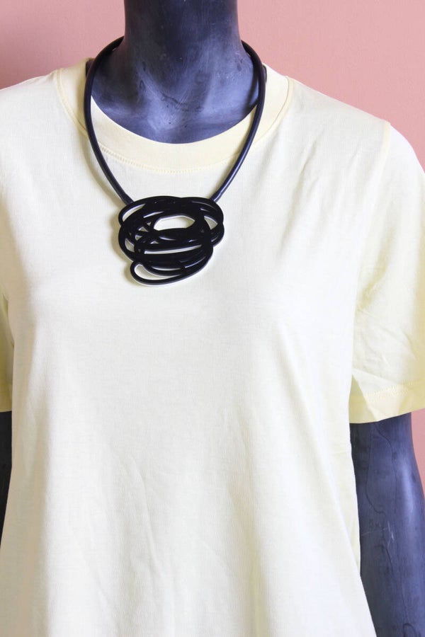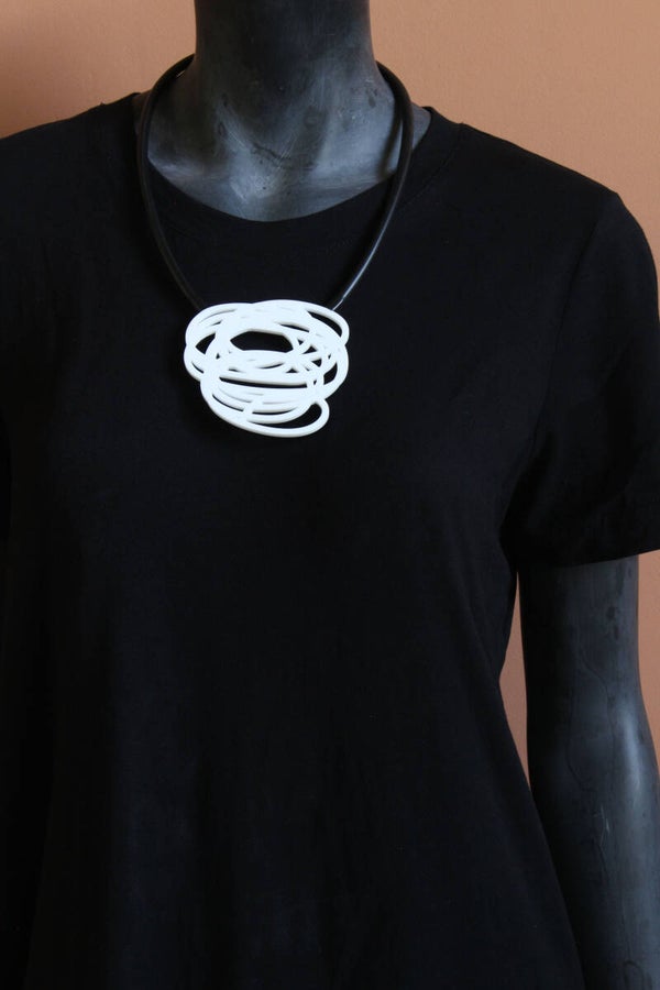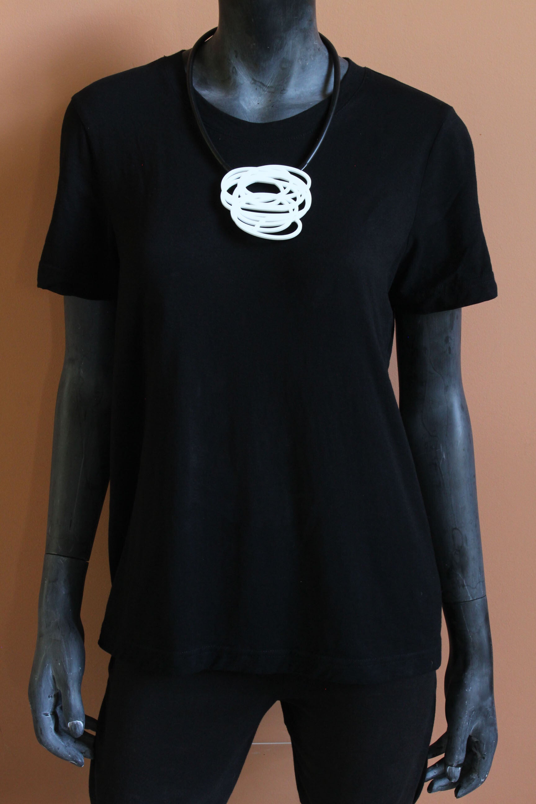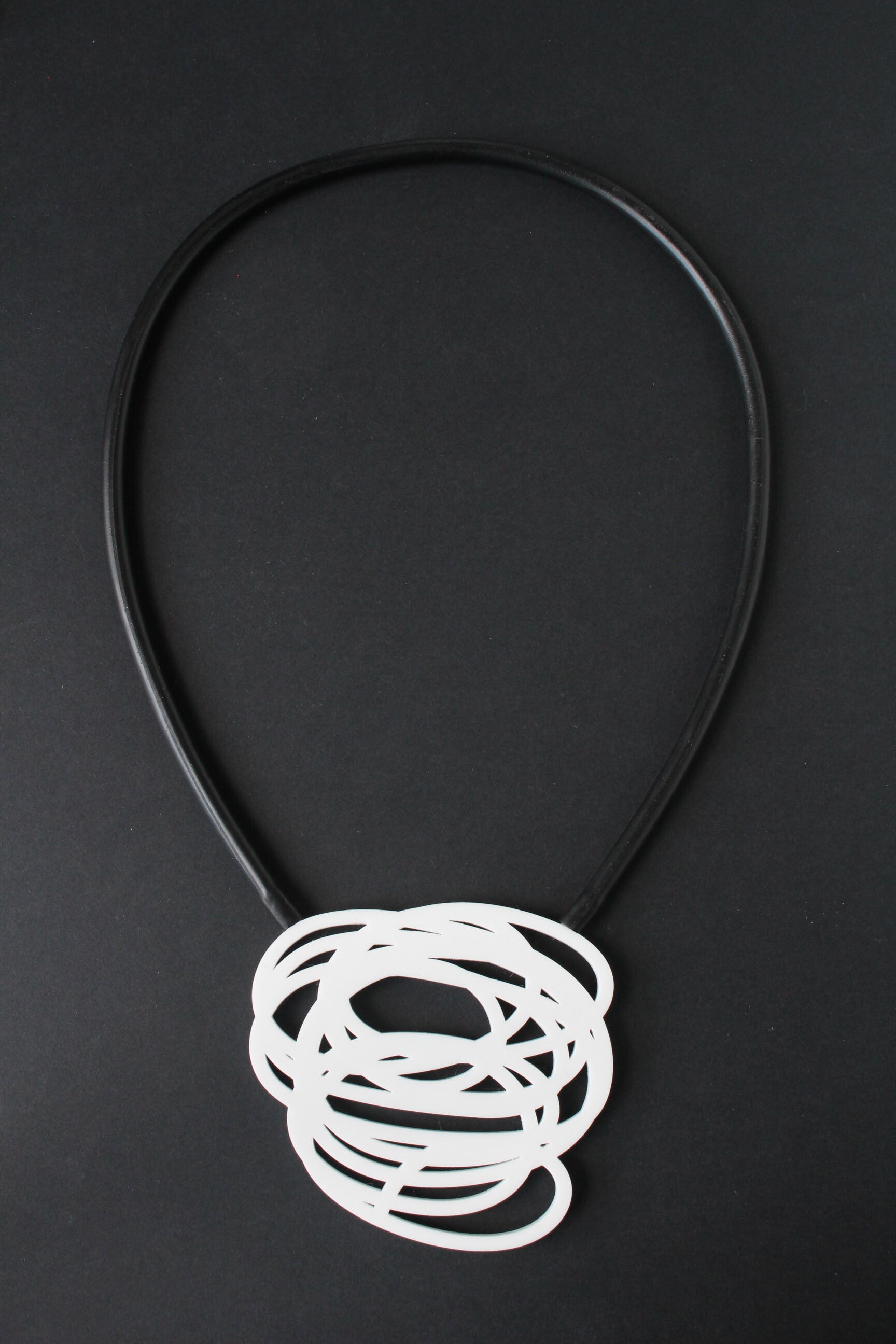 Ketting van zwart en wit acrylaat aan rubber koord. De ketting is tweezijdig te dragen.