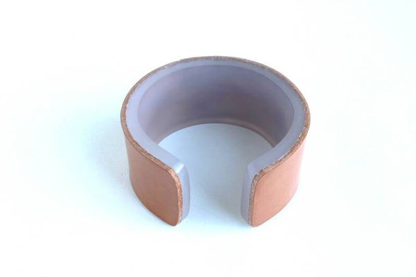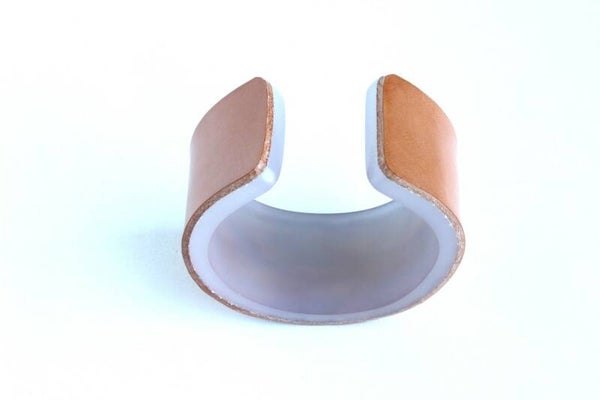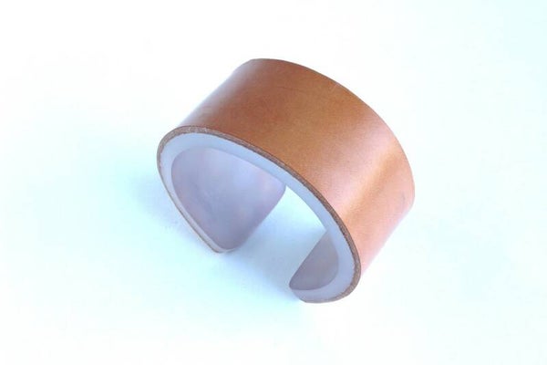 Armband van mat wit semi-transparant acrylaat /plexiglas en naturel tuigleer. Het leer is voorzien van een wax om het materiaal te beschermen tegen vocht en vuil.Binnenmaat ±7 cm x ±6 cm
