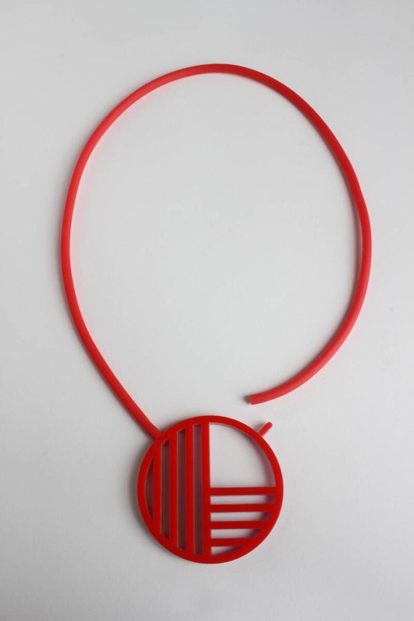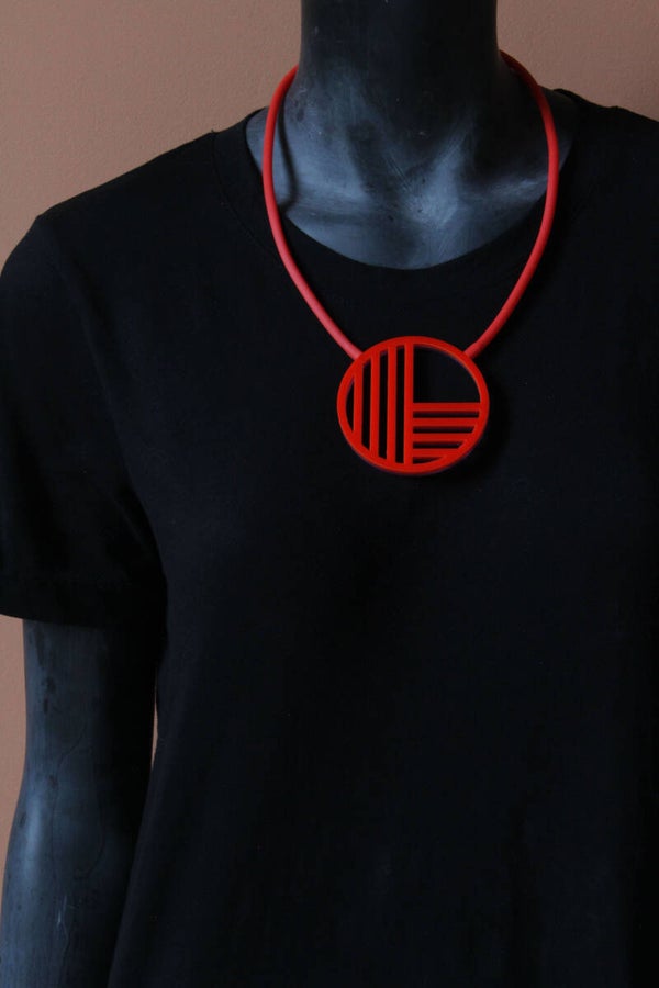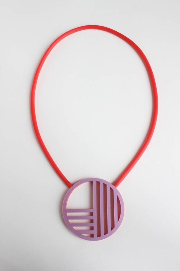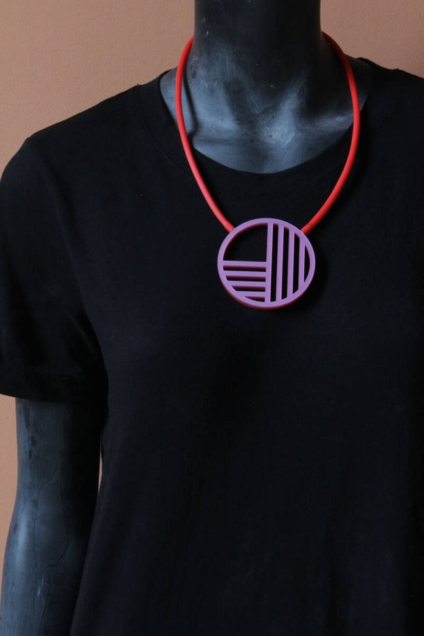 Ketting van rood en metallic roze acrylaat aan rubber koord. De ketting is tweezijdig te dragen.