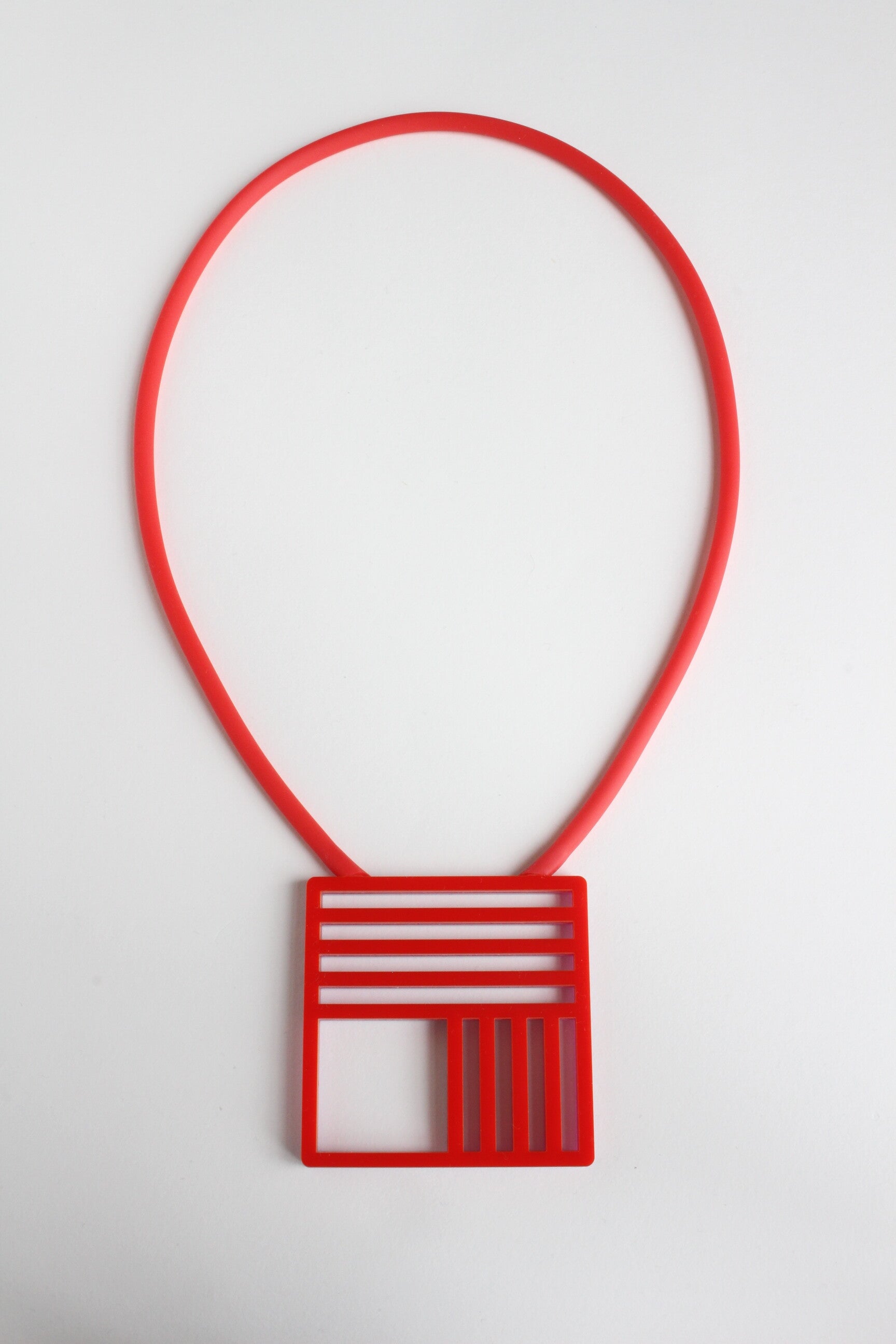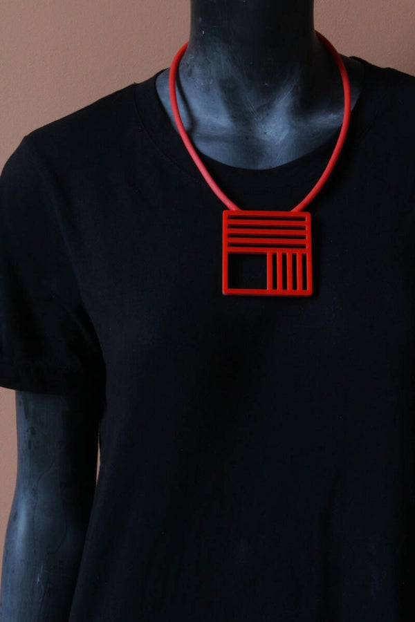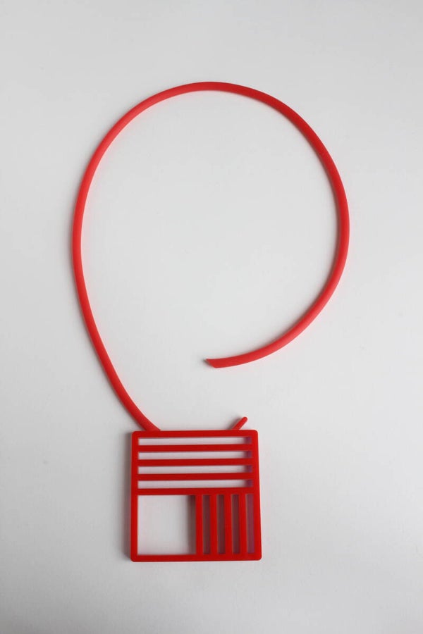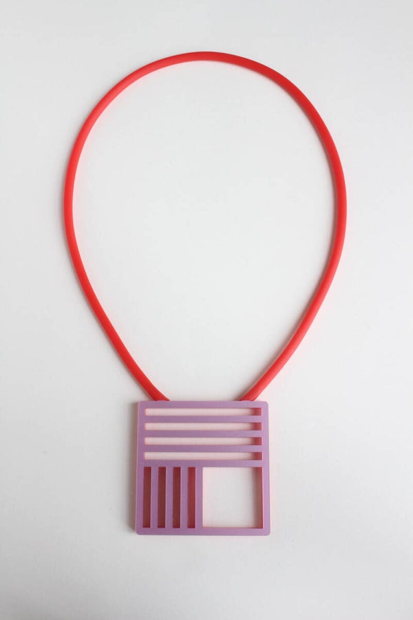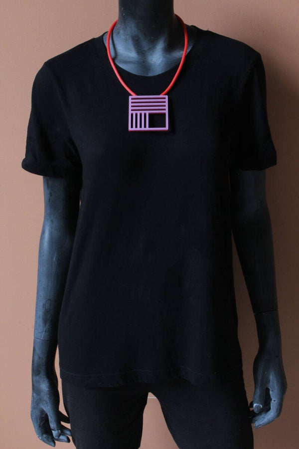 Ketting van rood en metallic roze acrylaat aan rubber koord. De ketting is tweezijdig te dragen.