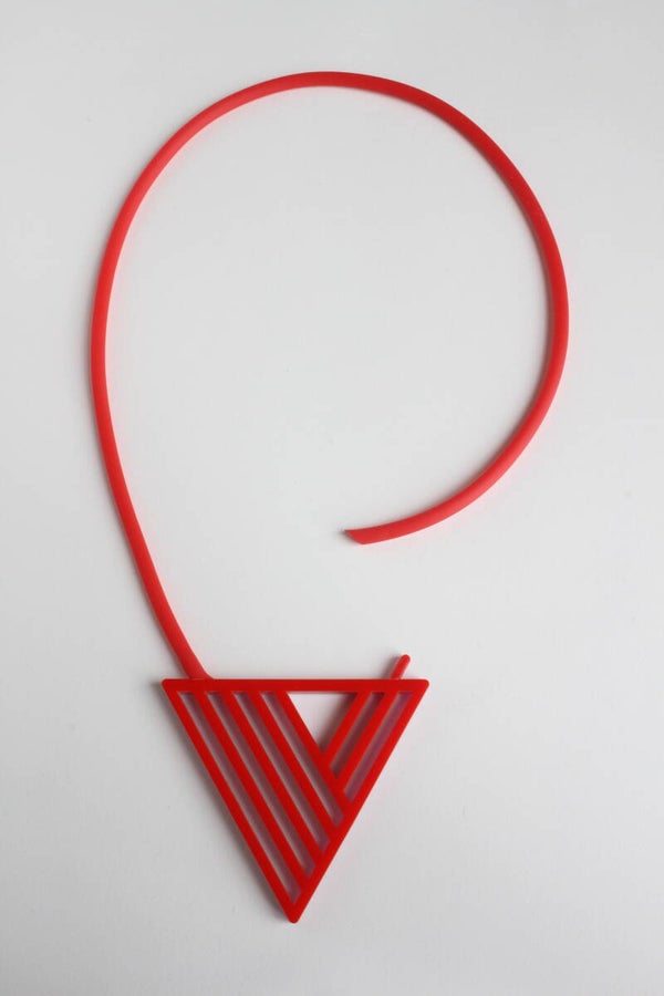 Ketting van rood en metallic roze acrylaat aan rubber koord. De ketting is tweezijdig te dragen.