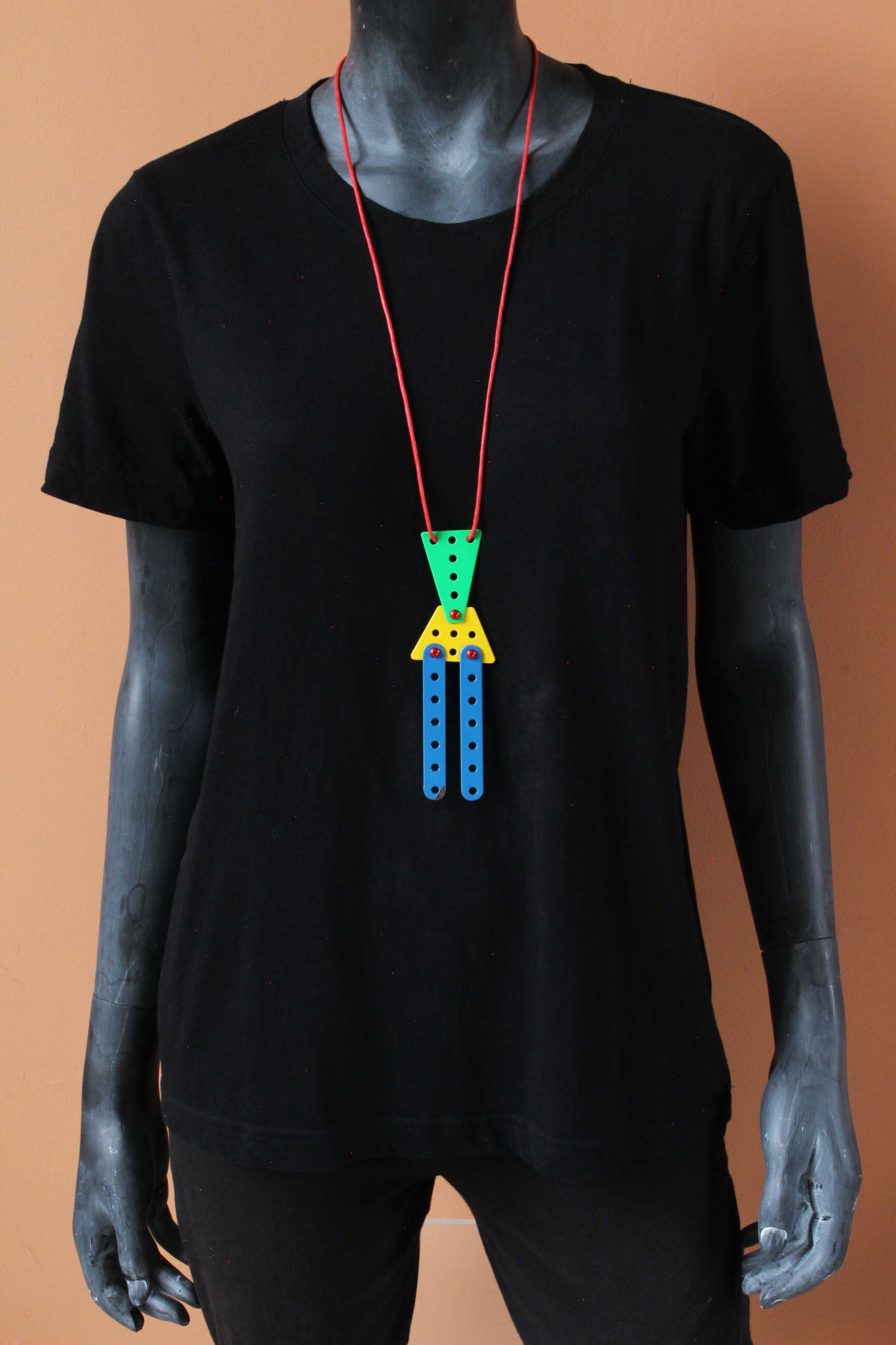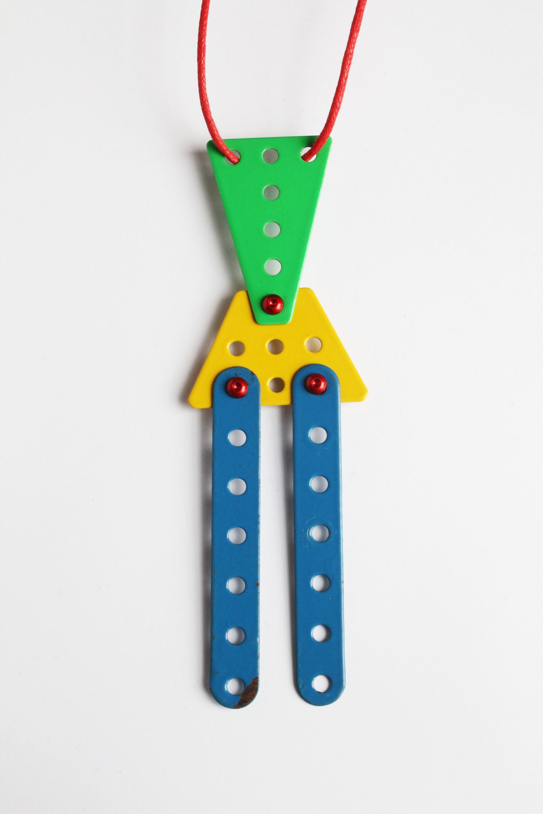 Ketting van geupcycled metaal aan een gewaxt katoenkoord. De verschillende onderdelen kunnen bewegen.
