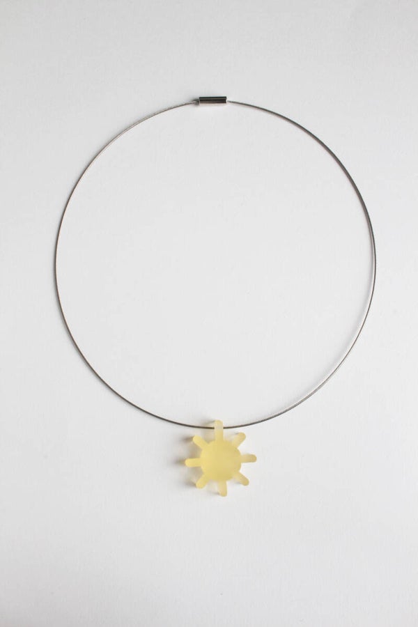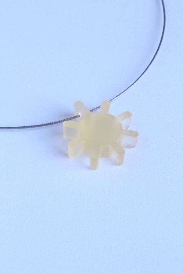 Hanger van deels mat geschuurd opaal geel acrylaat aan een spang van staaldraad met een schroefsluiting.