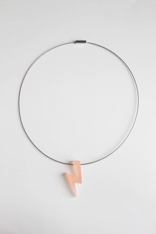 Hanger van mat geschuurd opaal oranje acrylaat aan een spang van staaldraad met een schroefsluiting.