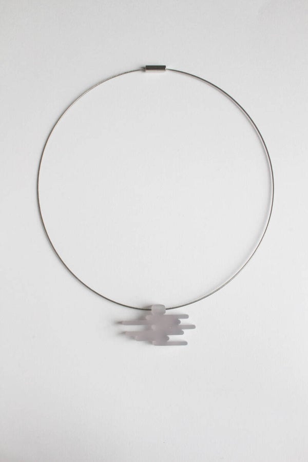 Hanger van mat geschuurd opaal grijs acrylaat aan een spang van staaldraad met een schroefsluiting.
