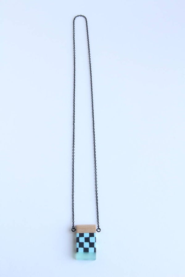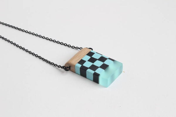 Hanger van acrylaat, polymeerklei en beukenhout aan een zwarte metalen ketting. De hanger is voorzien van een wax om het materiaal te beschermen tegen vocht en vuil.