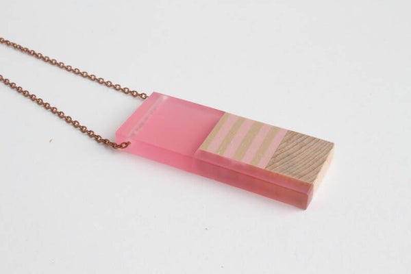 Ketting van acrylaat, polymeerklei en beukenhout aan een koperen metalen ketting met sluiting. De hanger is voorzien van een wax om het materiaal te beschermen tegen vocht en vuil. Hanger: 7,8 cm x 3 cm Ketting ±66 cm