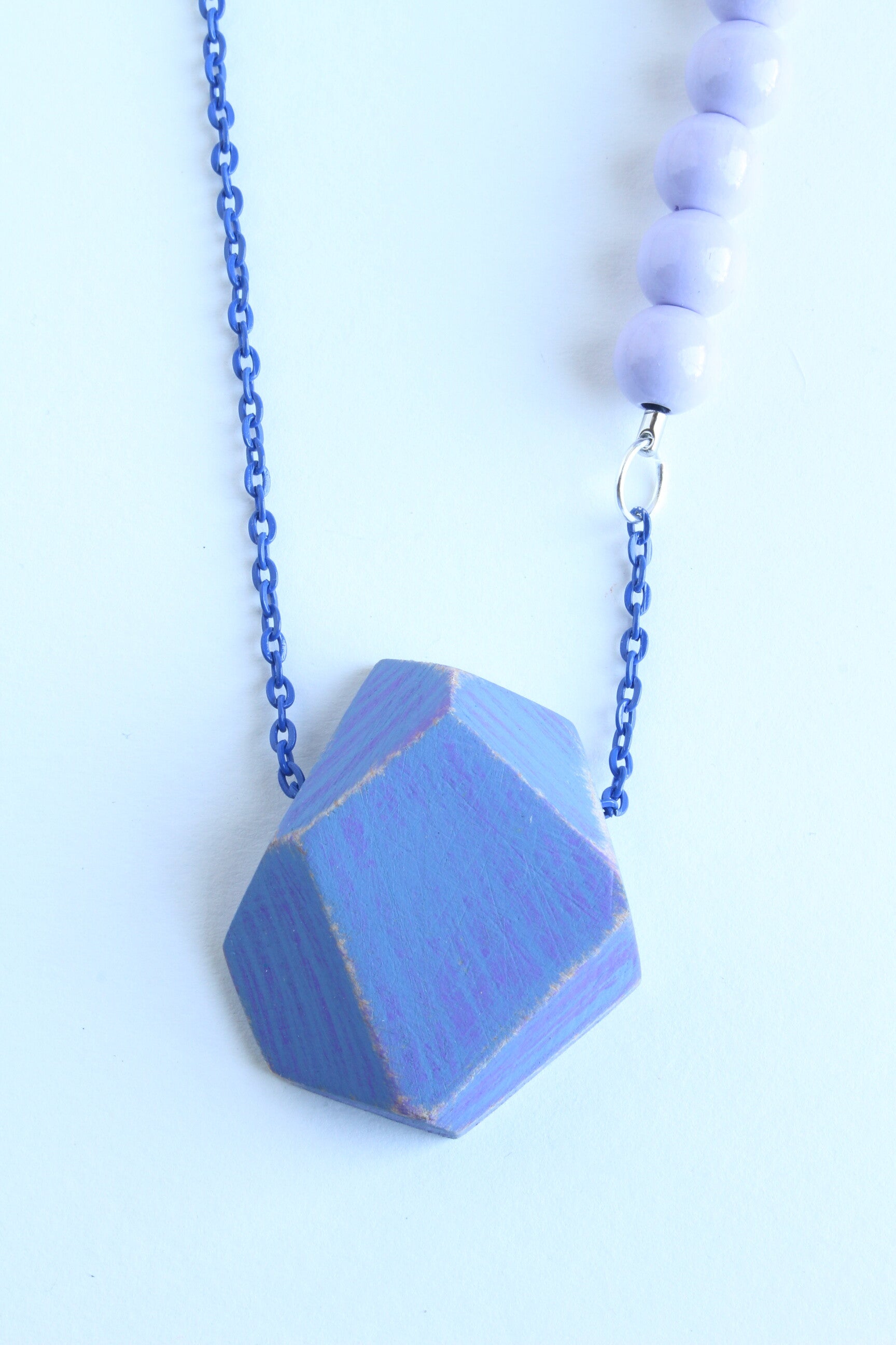 Hanger van geverfd beukenhout aan een ketting van metaal, acrylaat schakels, beukenhouten kralen en leerkoordHanger: ± 4 cm x 4 cm Ketting: lengte ±90 cm